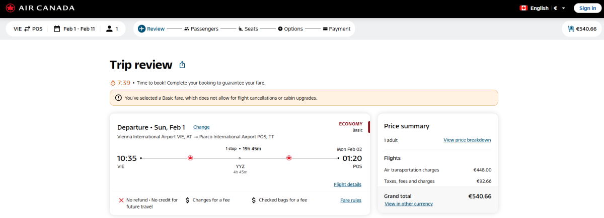 Der Flug wird mit einem Umstieg in Toronto durchgeführt. Auf dem Hinweg beträgt die Umsteigezeit 4 Stunden und 45 Minuten. Auf dem Rückweg beträgt die Aufenthaltsdauer ca. 11 Stunden - man kommt um 7:20 Uhr in Toronto an und der Anschlussflug nach Wien geht erst um 18:30 Uhr, was für eine kurze Stadtbesichtigung genutzt werden kann.