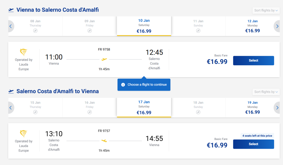 Für viele Termine im Januar und Februar können Sie mit Ryanair Hin- und Rückflugtickets von Wien zum Flughafen Salerno kaufen, der ein guter Ausgangspunkt für Reisen entlang der Amalfiküste ist.