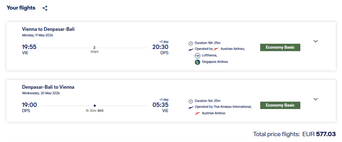 Der Flug nach Bali hat einen Anschluss in München und Singapur, der Rückflug nur in Bangkok.