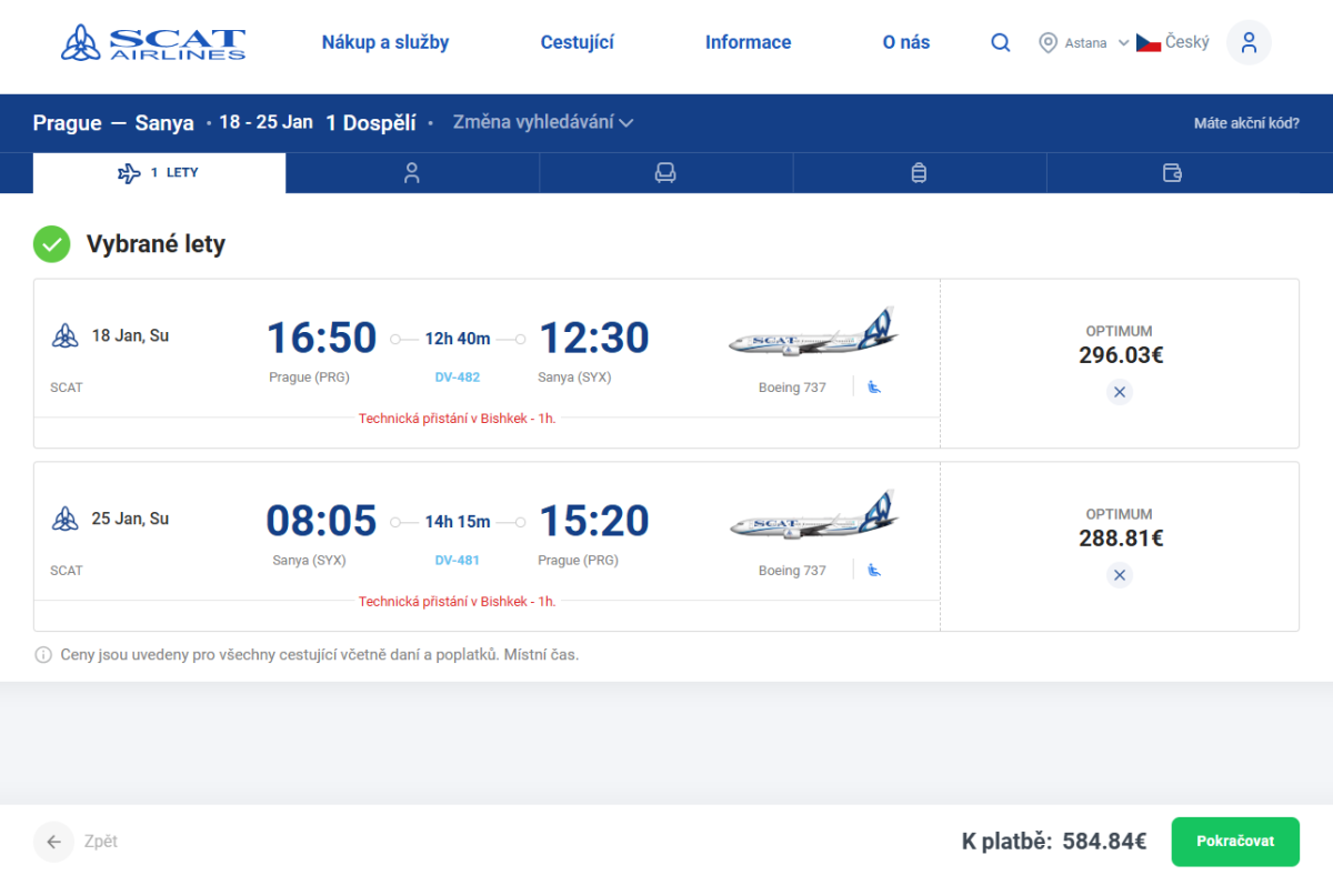 Die Flüge werden von SCAT Airlines mit einer Boeing 737 MAX 9 durchgeführt, mit einer kurzen technischen Zwischenlandung in Bischkek, Kirgisistan, bei der Sie an Bord bleiben.