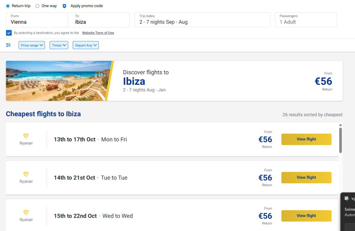 Der Herbst muss nicht das Ende des Sommers bedeuten. Im Oktober kann man mit Ryanair von Wien nach Ibiza fliegen, um die Sonne und die ruhige Atmosphäre der Insel außerhalb der Hauptsaison zu genießen - mit angenehmen Temperaturen und badefähigem Meer.