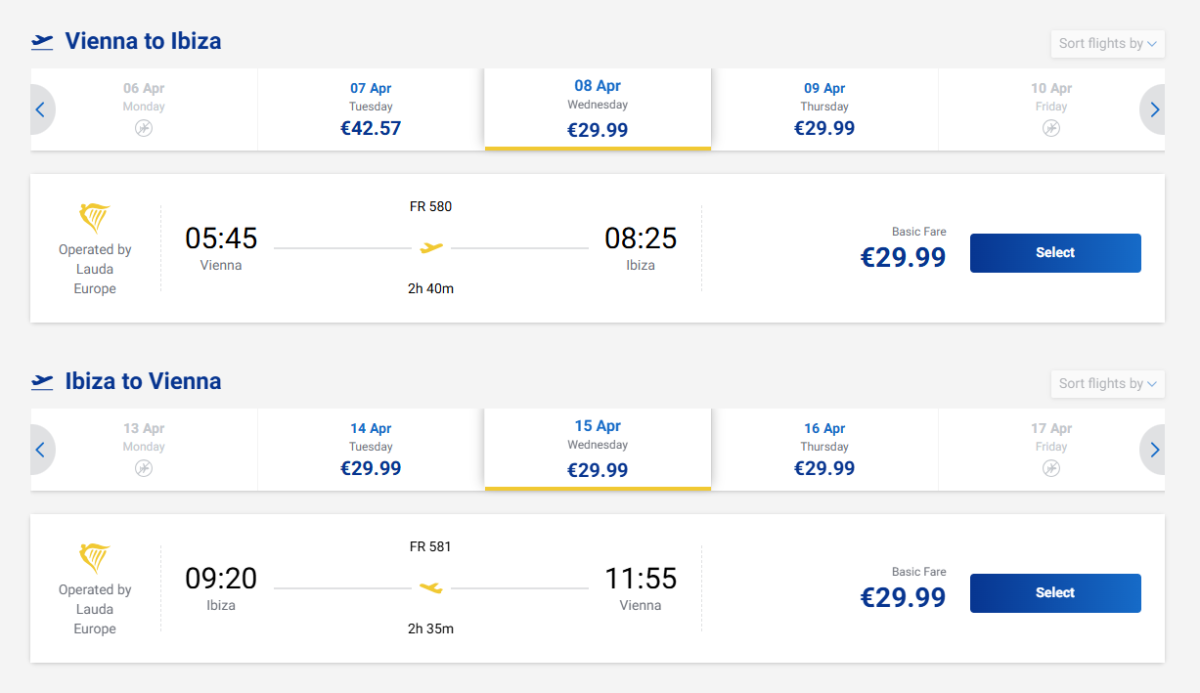 Ab Ende März fliegt Ryanair wieder auf einer saisonalen Strecke von Wien nach Ibiza in Spanien. Die Frühlingsmonate sind eine der Zeiten, in denen man die Insel zu günstigen Preisen und in einer ruhigeren Atmosphäre außerhalb der Hauptsommersaison genießen kann.