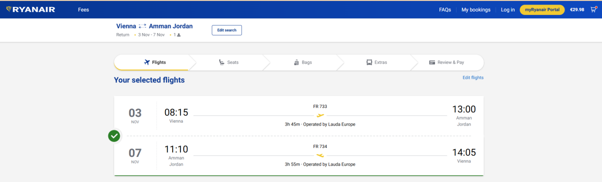 Entdecken Sie den Zauber des Nahen Ostens für ein paar Kronen. Ryanair bietet Hin- und Rückflugtickets von Wien nach Amman für 30 Euro an. Termine sind fast den ganzen November und Anfang Dezember zu finden.