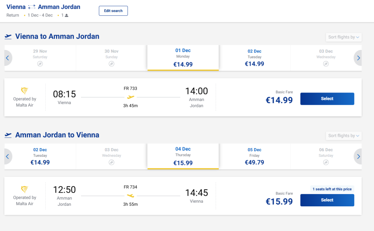 Ryanair bietet derzeit Hin- und Rückflugtickets von Wien nach Amman ab 30 Euro an und es gibt mehrere günstige Termine Ende November und Anfang Dezember.