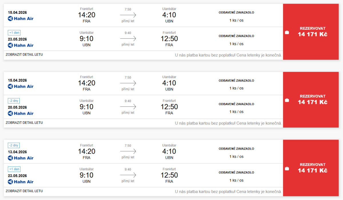 Wenn Sie es vorziehen, von Prag aus zu fliegen, können Sie mit einem Ticket einen Lufthansa-Umsteigeflug nach Frankfurt nehmen und mit einem MIAT-Direktflug nach Ulaanbaatar weiterreisen. Der Gesamtpreis beläuft sich auf etwa 753 Euro.