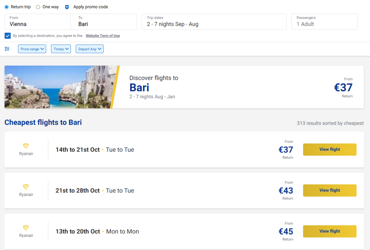 Nutzen Sie die günstigen Preise von Ryanair für Flüge nach Bari, Italien.