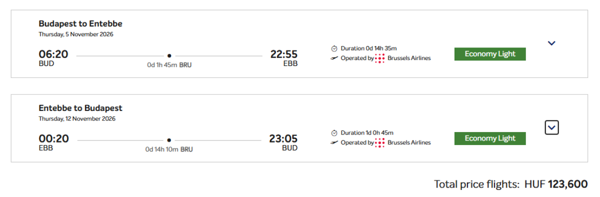 Für dieses Abenteuer können Sie mit Brussels Airlines von Budapest aus starten. Spezielle Rückflugtickets nach Entebbe sind von September bis November zu Preisen ab 123 600 huf erhältlich.