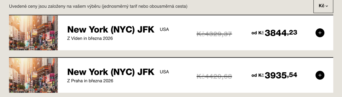 Für Flüge nach New York können Sie sich die verfügbaren Termine noch einmal zu günstigen Preisen ansehen. Hin- und Rückflugtickets von Prag oder Wien können für 285 Euro mit einmaligem Umsteigen in Frankfurt erworben werden.
