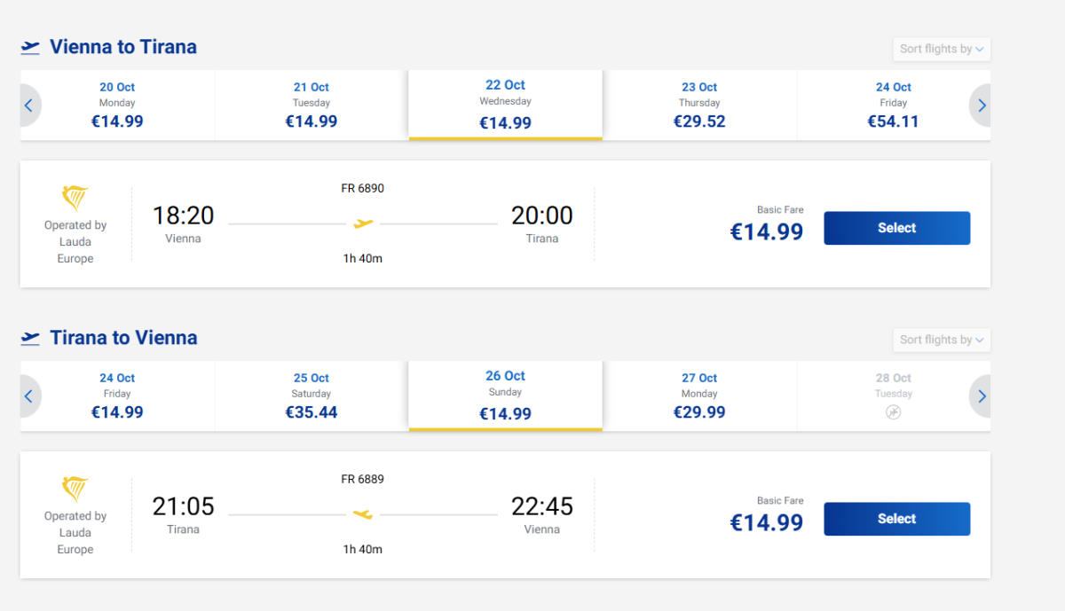 Ryanair bietet günstige Rückflugtickets von Wien nach Tirana, Albanien. Tickets für 30 eur im Oktober.