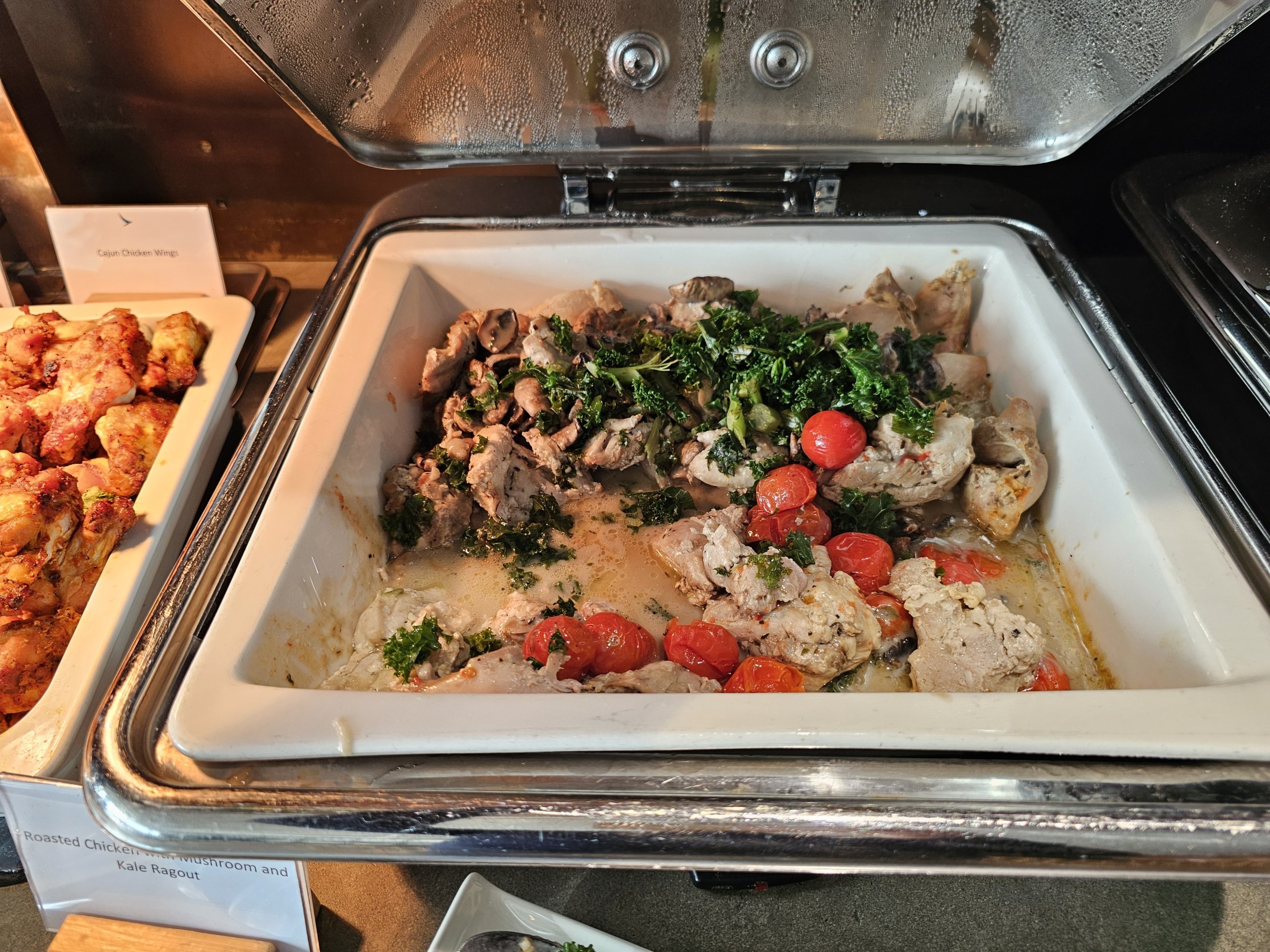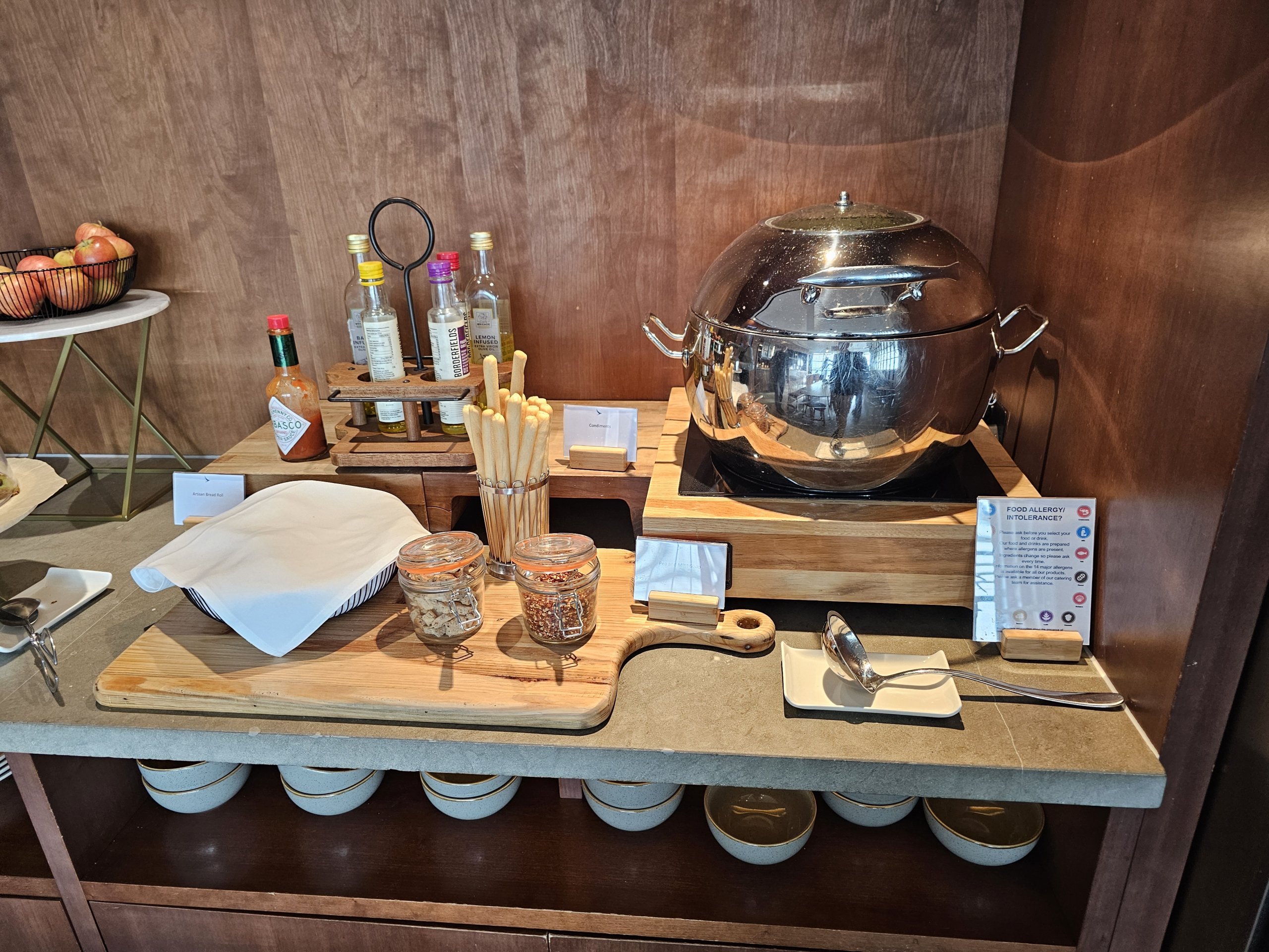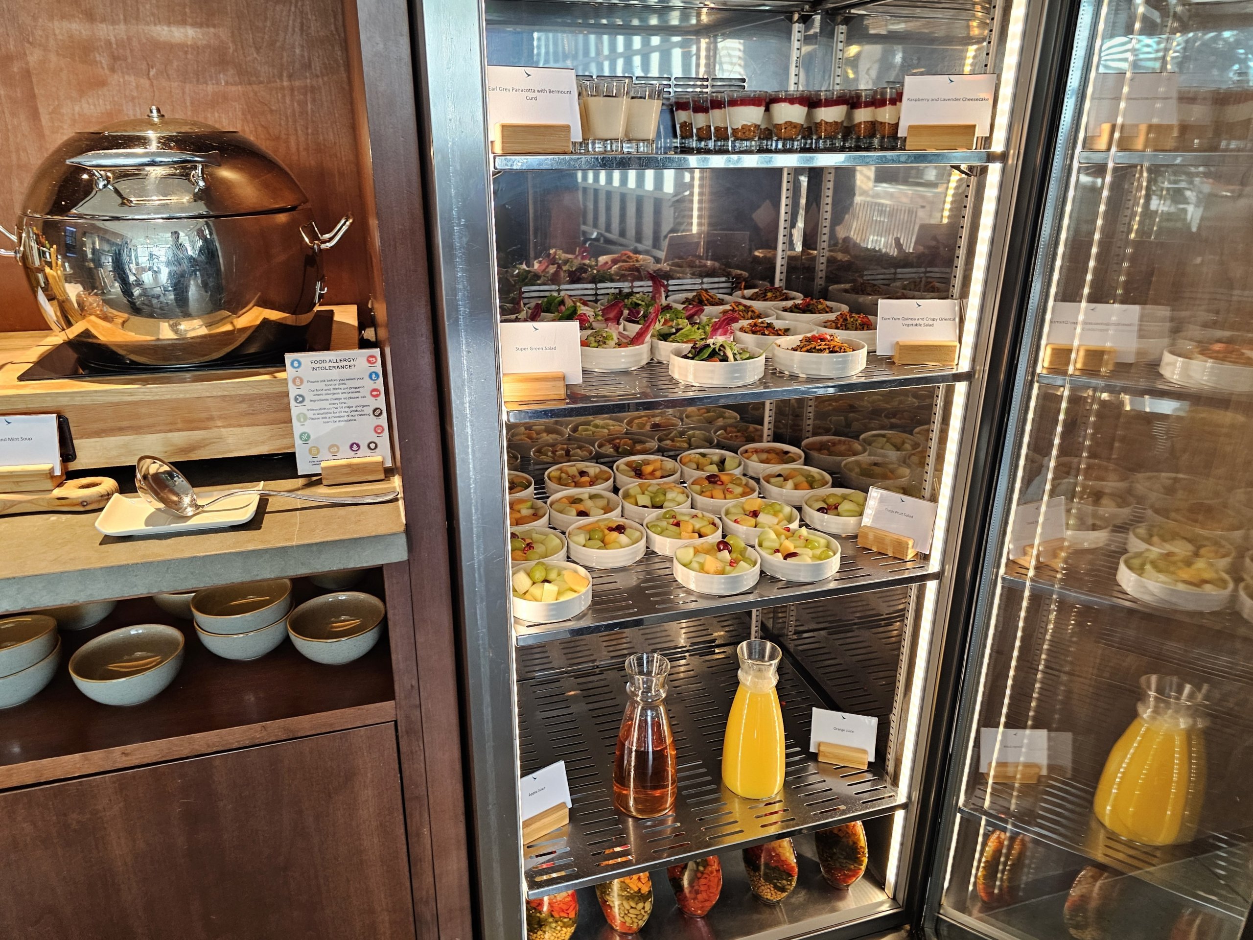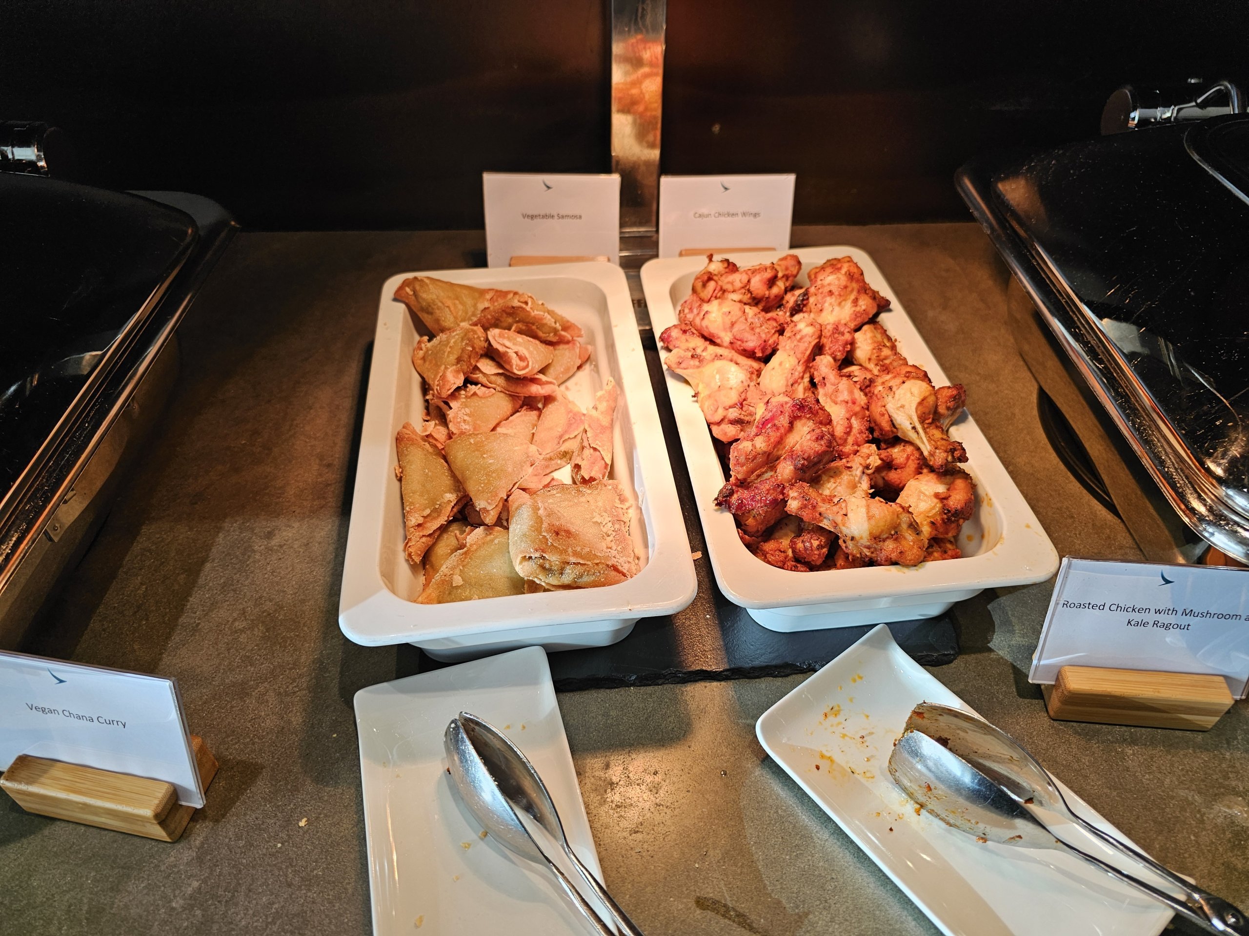 In einem anderen Teil der Lounge befindet sich das klassische Buffet - hier gibt es immer eine Auswahl von 4 Sorten warmer Speisen. Wir waren erst am Nachmittag in der Lounge, daher weiß ich nicht, wie das Frühstücksangebot aussieht.