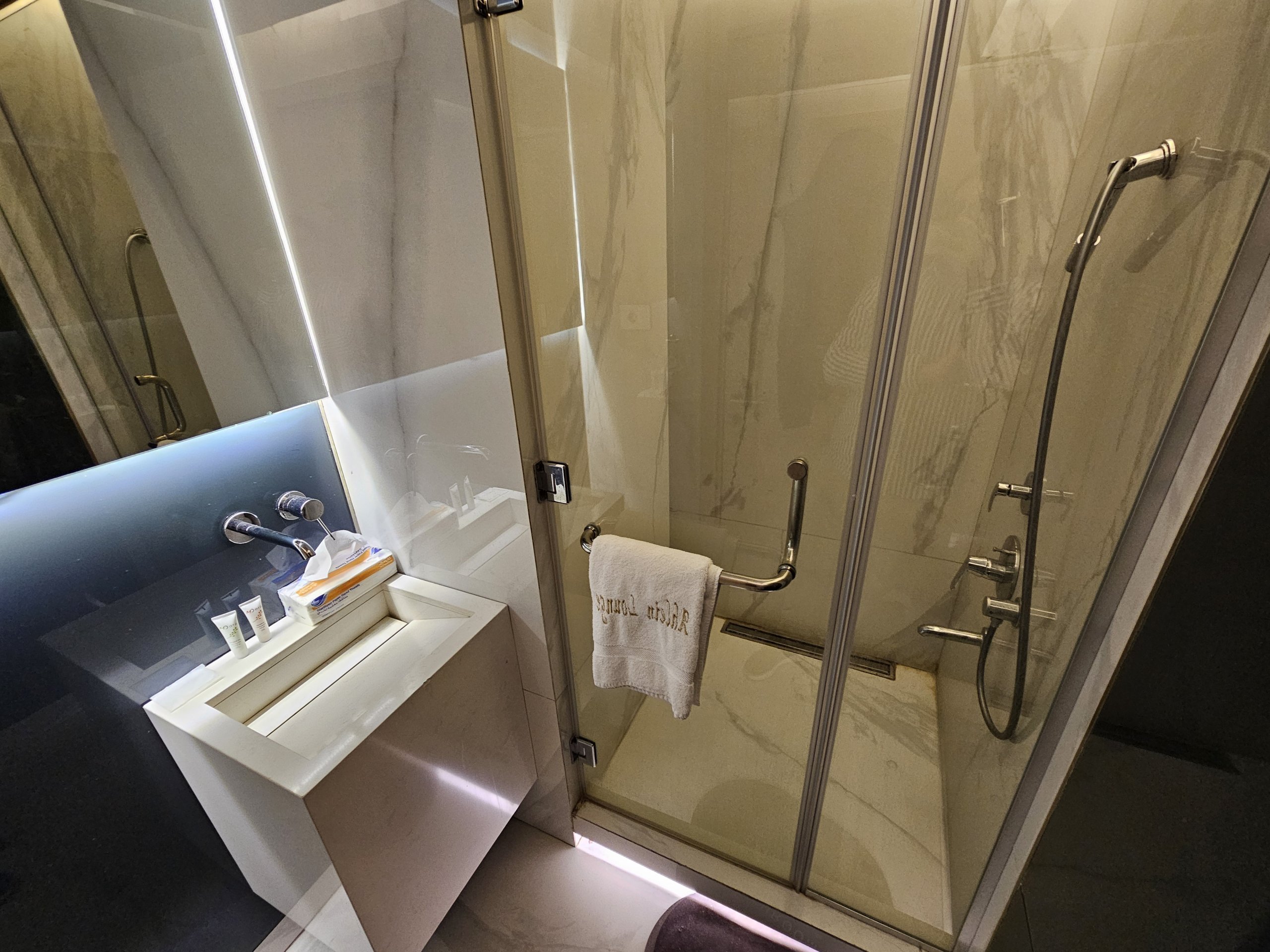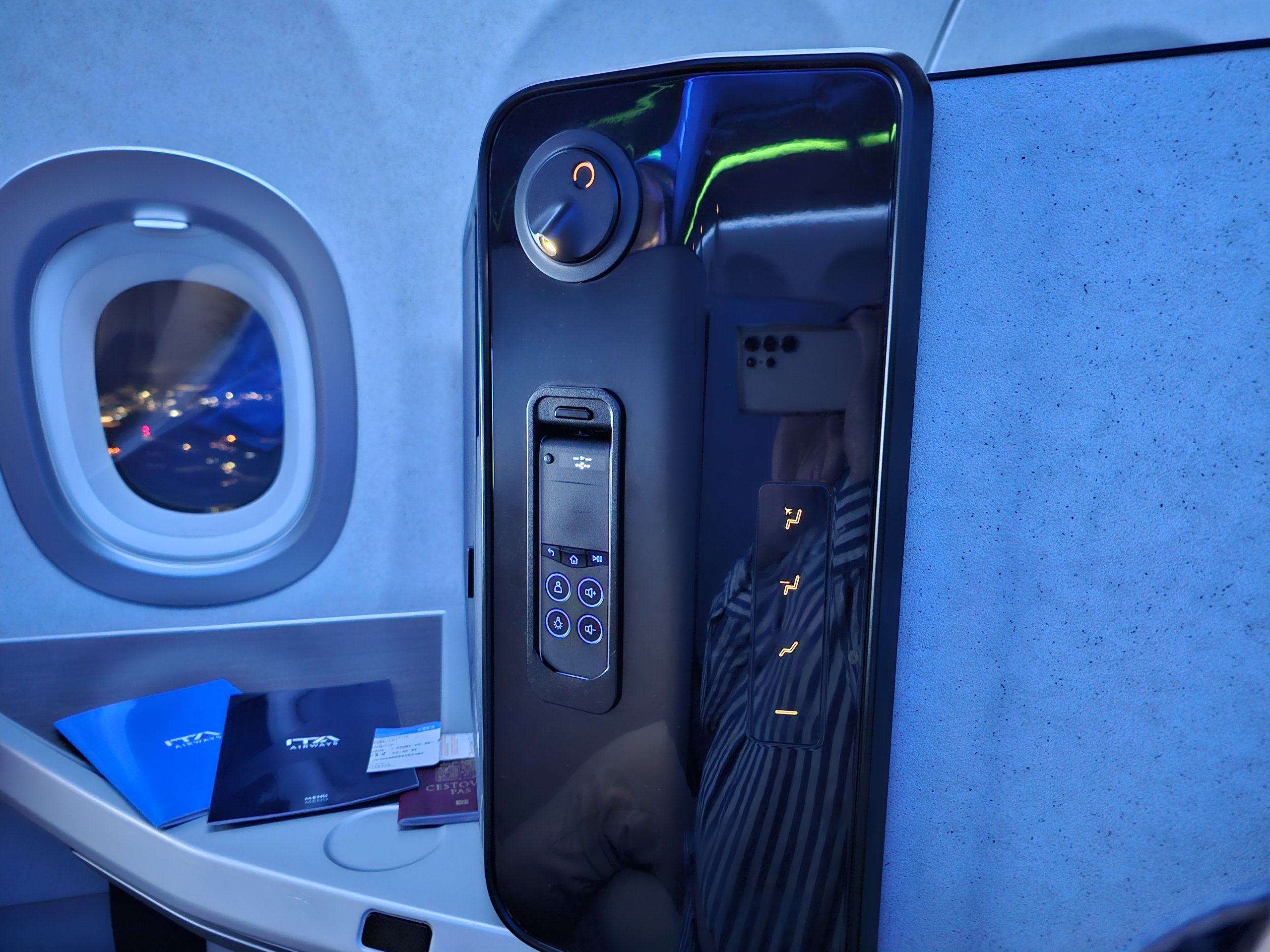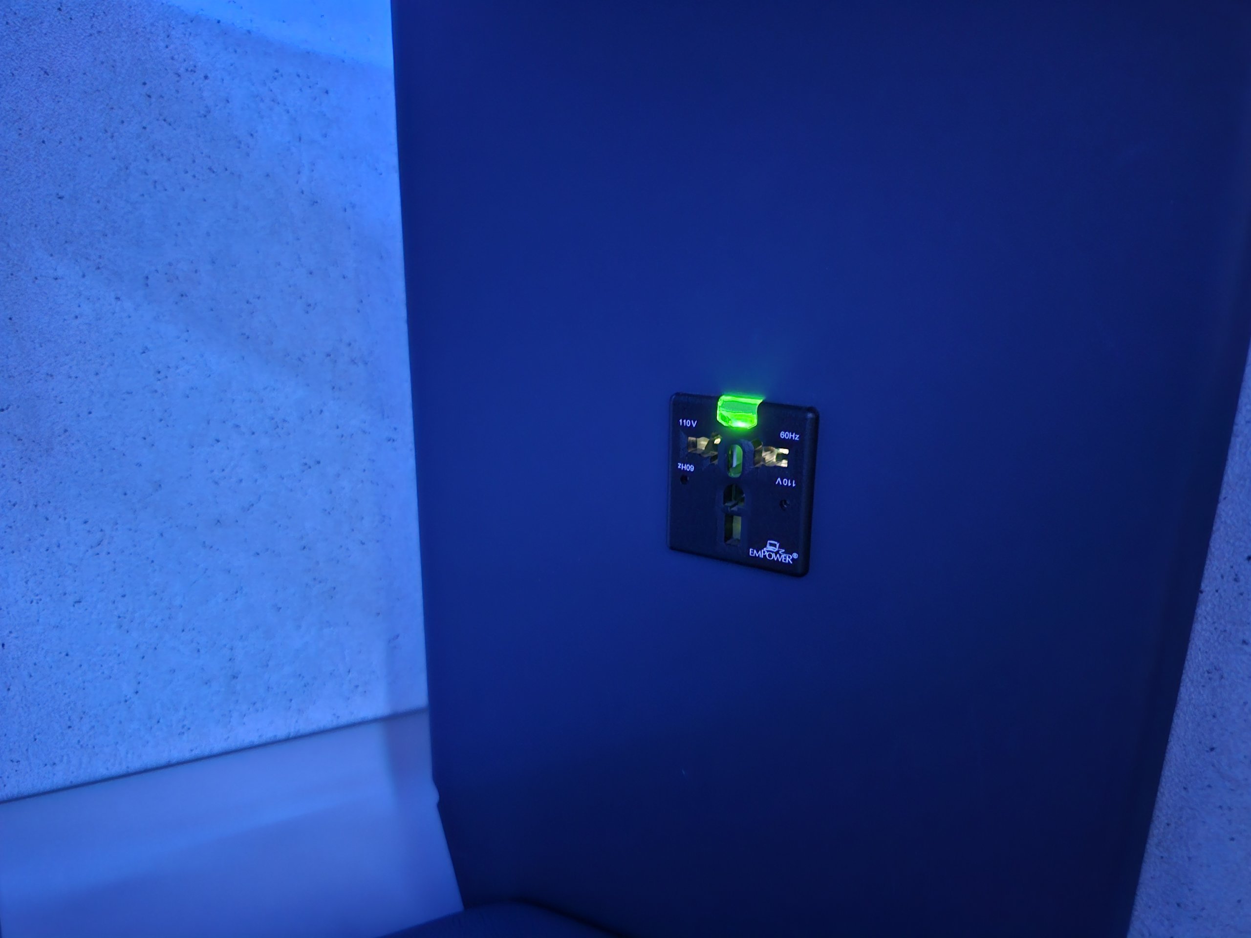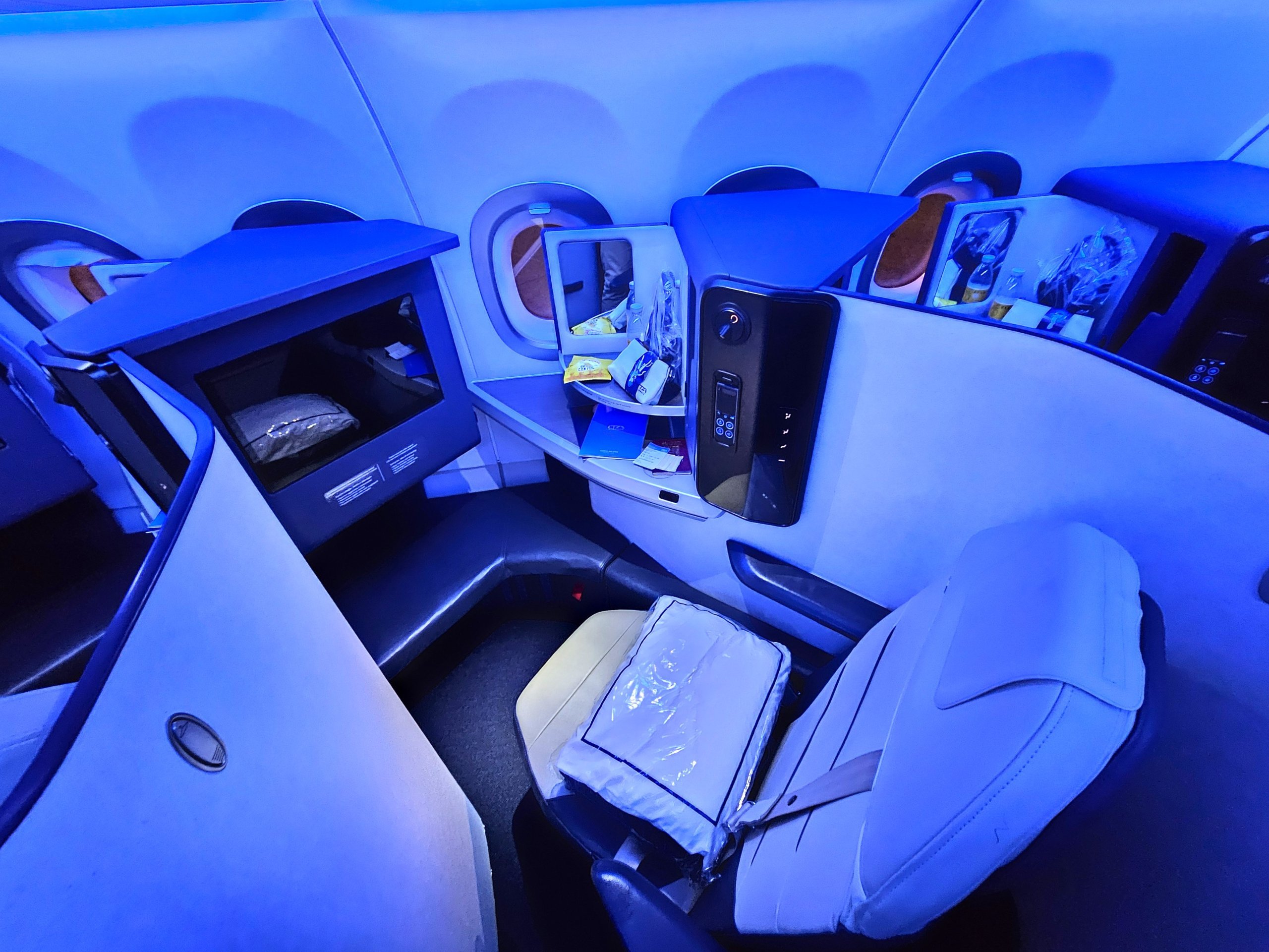 Die elegante Atmosphäre wird durch die blaue Nachtbeleuchtung noch unterstrichen, als unser Flug um 4:35 Uhr morgens abhebt.