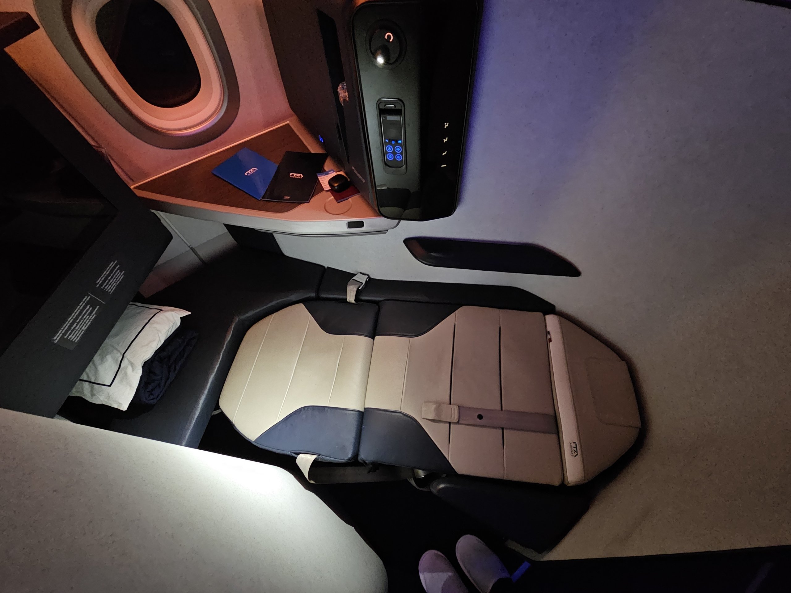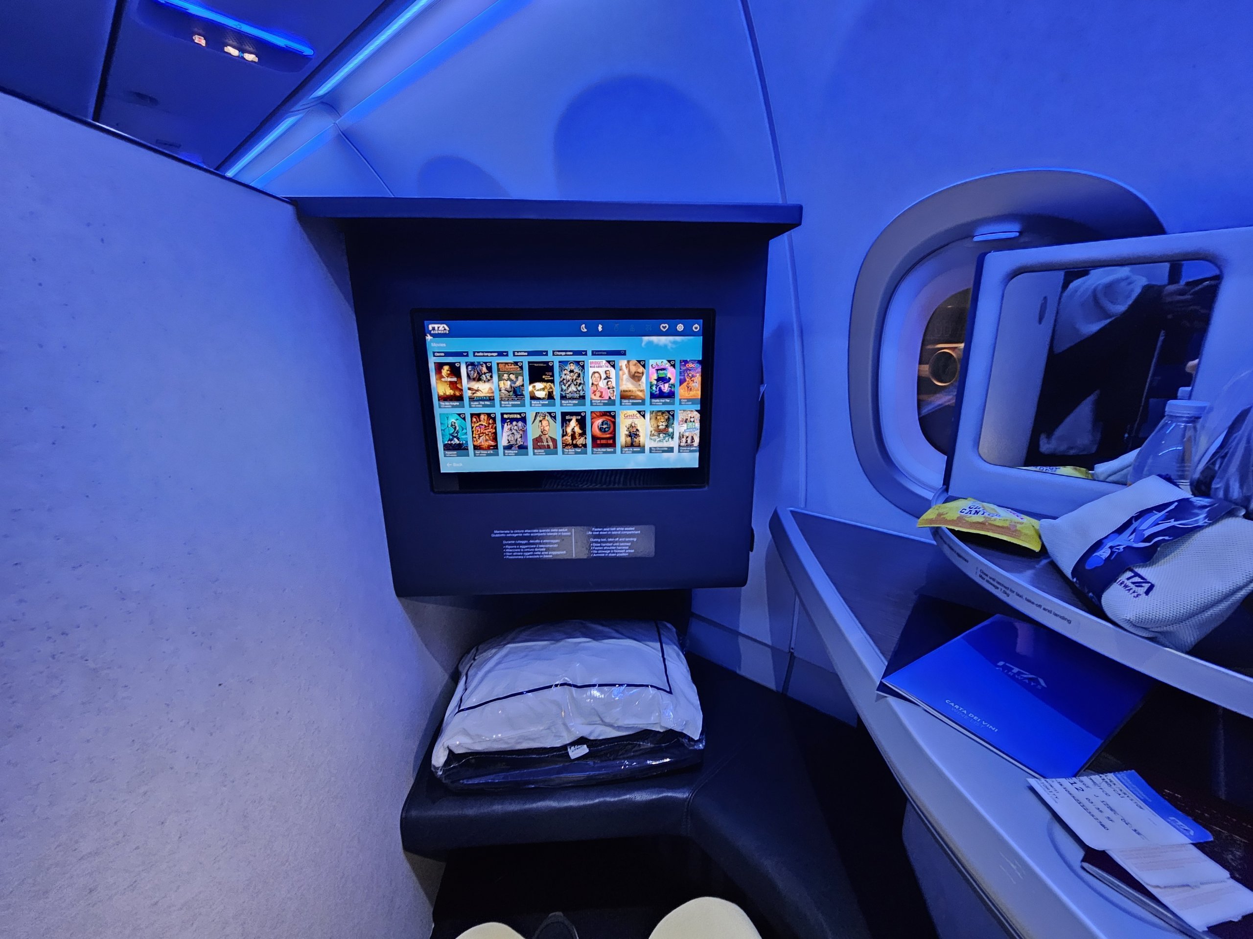Am Sitzplatz werden mir ein Kissen, eine Decke und Hausschuhe zur Verfügung gestellt. Es gibt keine Matratze oder Bettzeug, aber das ist bei Kurzstreckenflügen bei keiner Fluggesellschaft Standard.