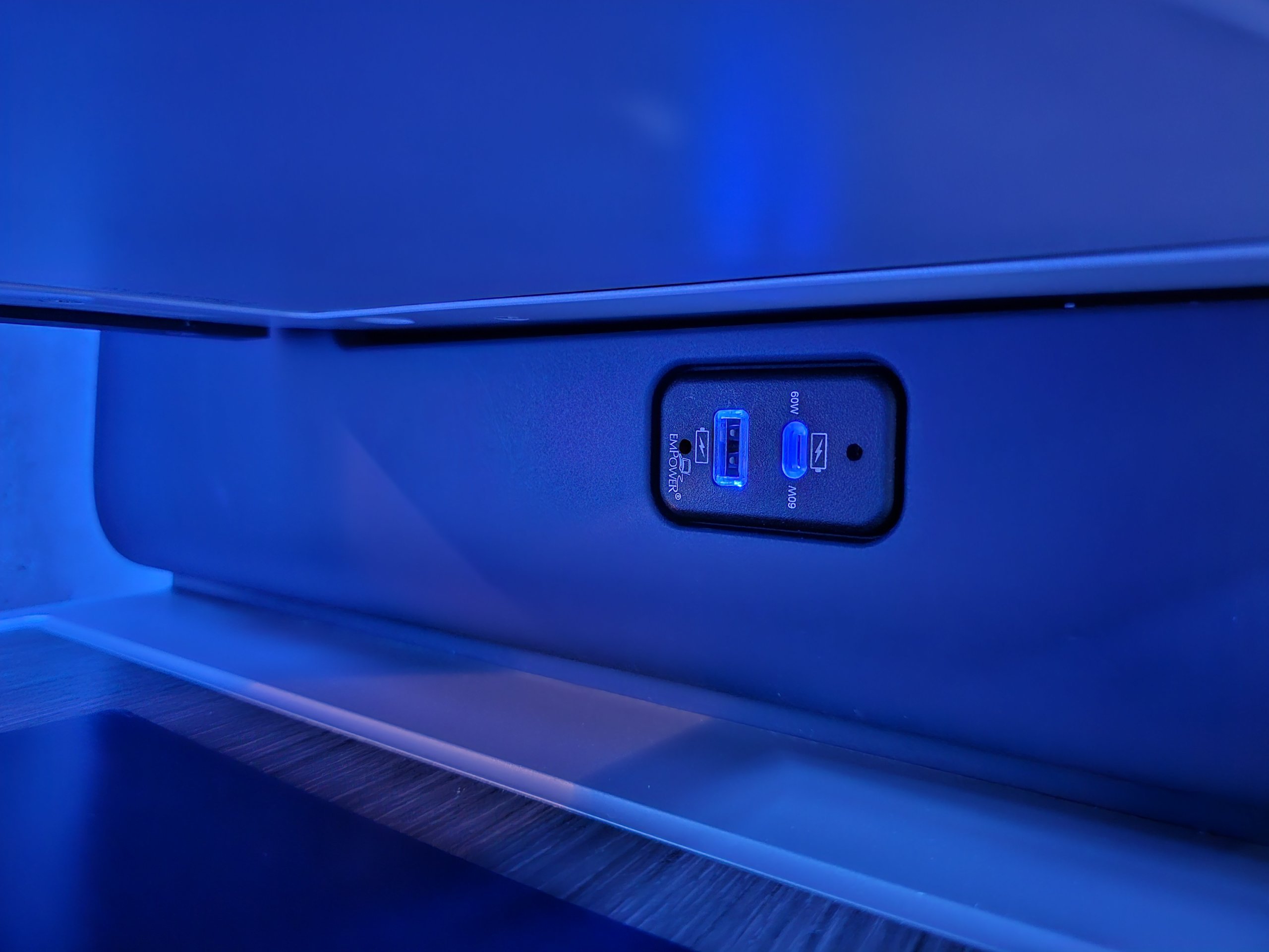 Der Sitz verfügt über USB-A- und USB-C-Anschlüsse sowie eine Universalsteckdose zum Aufladen elektronischer Geräte.