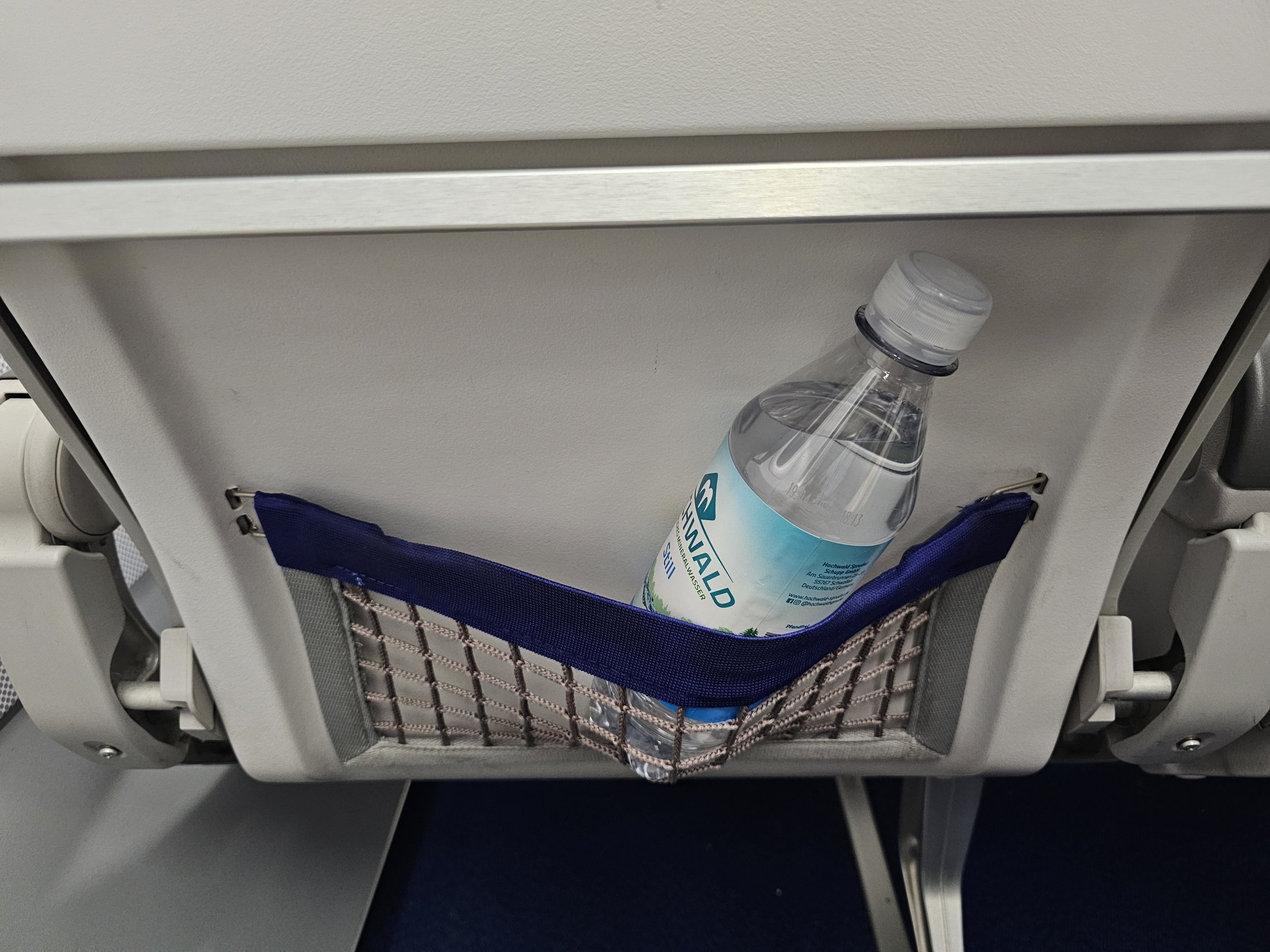 Vor dem Abflug gibt es kein Begrüßungsgetränk. Stattdessen gibt es nur eine 0,5-Liter-Flasche Wasser in einem Netz neben dem Sitz.