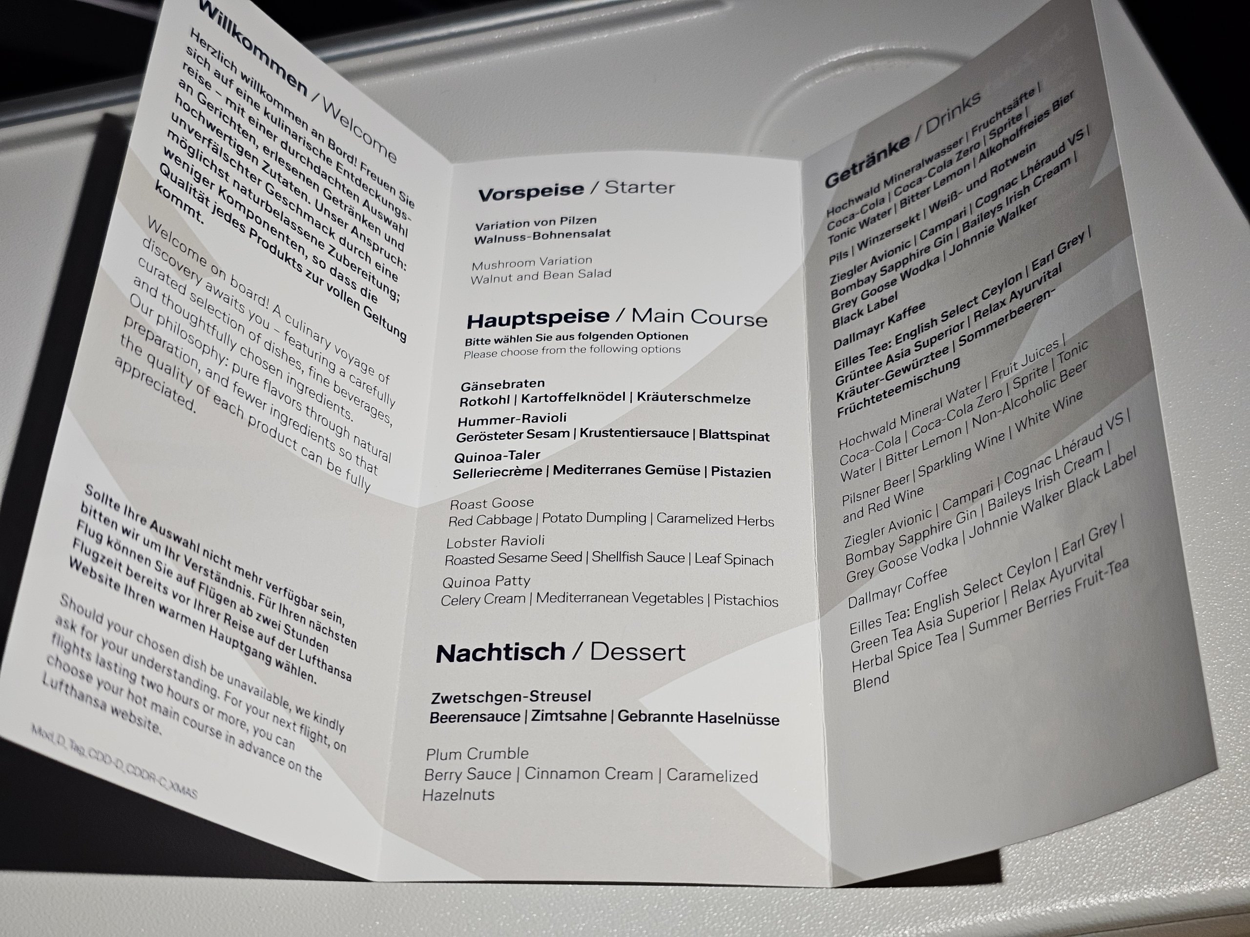 Der Hauptservice kommt erst etwa 1,5 Stunden nach dem Abflug. Die Passagiere haben ein klassisches gedrucktes Menü mit nur 2 Hauptgerichten zur Auswahl. Es gibt nur eine Vorspeise und eine Nachspeise.