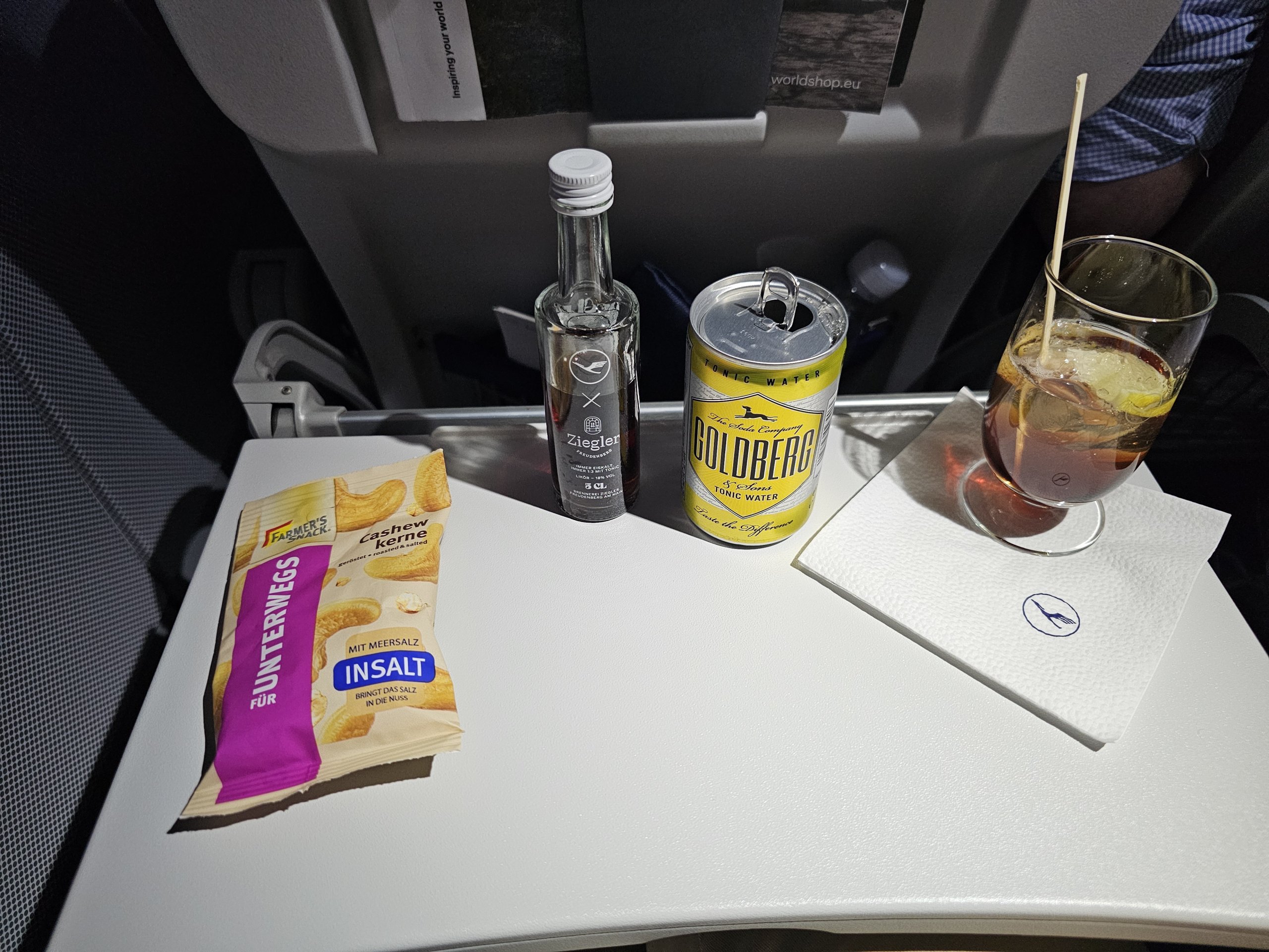 Etwa 20 Minuten nach dem Start kommt der erste Service in Form eines Getränks und einer Tüte mit Keksen. Natürlich habe ich meinen Lieblingscocktail der Lufthansa, den Avionic.