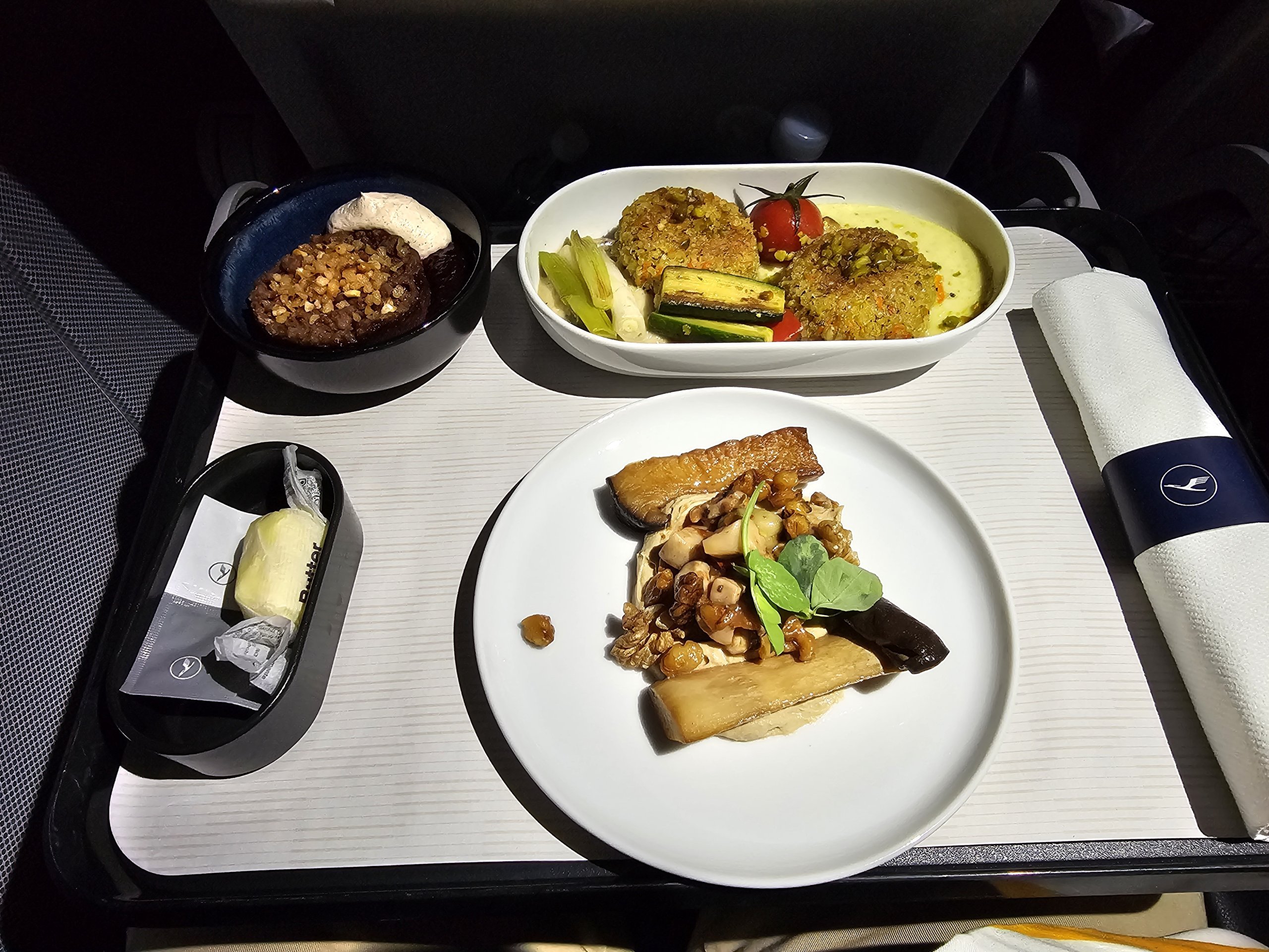 Ich habe schon bessere Mahlzeiten im Flugzeug gegessen, das Quinoa ist getrocknet und paniert, so dass die Mahlzeit nicht so leicht ist, wie ich erwartet hatte. Aber die Pilzvorspeise ist großartig und auch der Pflaumen-Crumble ist köstlich,