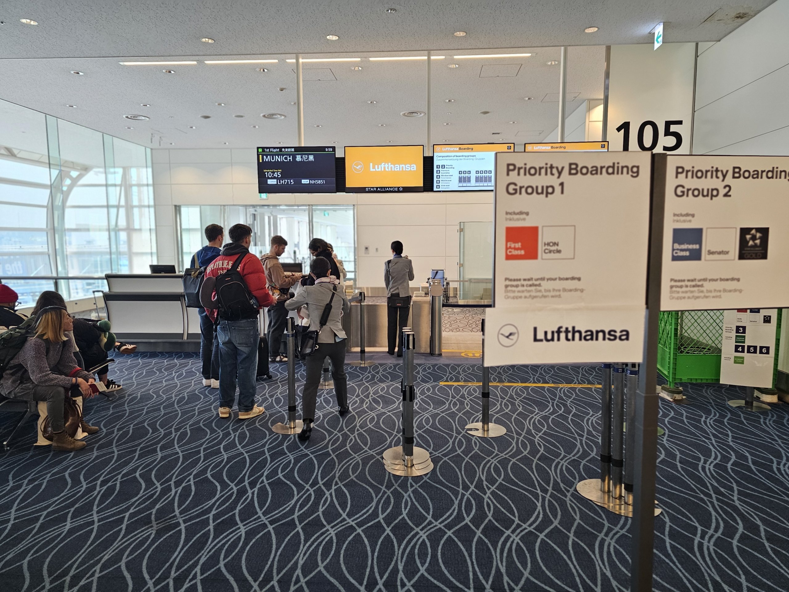 Da ich zwei große Koffer habe, muss ich zum Check-in-Schalter gehen. Leider hat die Lufthansa am Flughafen Haneda keine automatischen Schalter, so dass ich warten muss, bis die Check-in-Zeit beginnt.