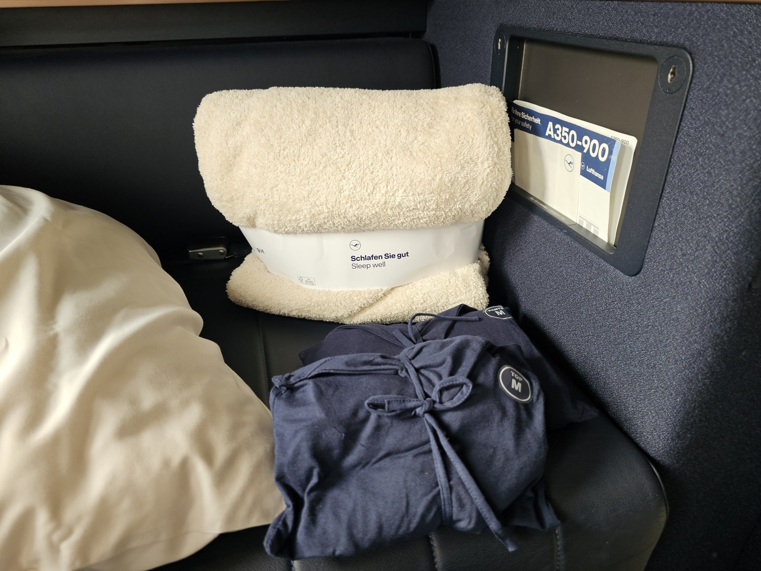 Der Sitz ist mit einem äußerst bequemen Kissen und einer Decke ausgestattet, die man während des Fluges jederzeit benutzen kann. Zum Schlafen erhalten Sie dann von der Crew eine weitere Decke und Bettzeug.