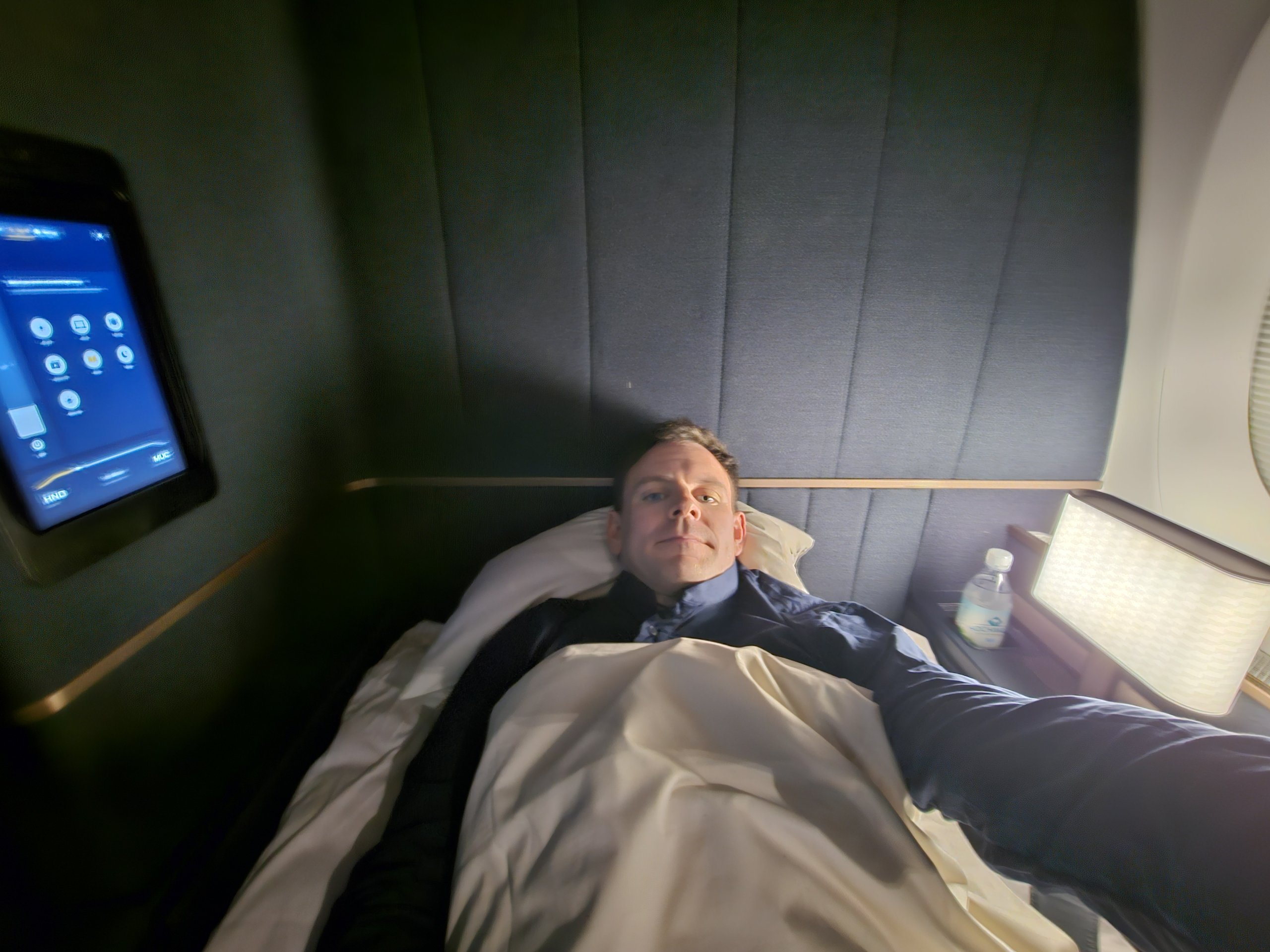 Deshalb gehe ich kurz nach dem Mittagessen auf die Toilette, um meinen Schlafanzug anzuziehen. In der Zwischenzeit bereitet ein hilfsbereiter Steward mein Bett vor (man kann den Sitz selbst per Knopfdruck ausklappen, aber die Laken und die Decke sind in Fächern untergebracht, zu denen nur die Crew Zugang hat).