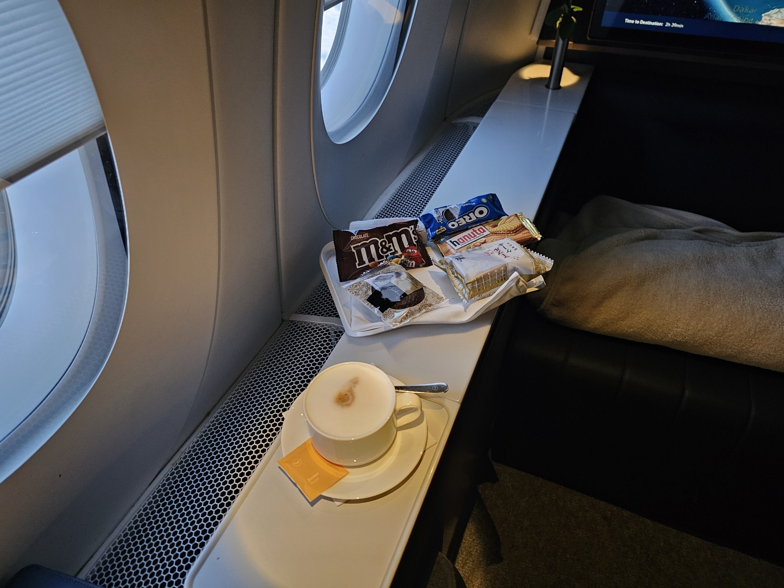 Vor dem Schlafengehen bekomme ich von der Crew einen Korb mit Süßigkeiten und salzigen Crackern, die in der Bordküche für die Dauer des Fluges bereitstehen.