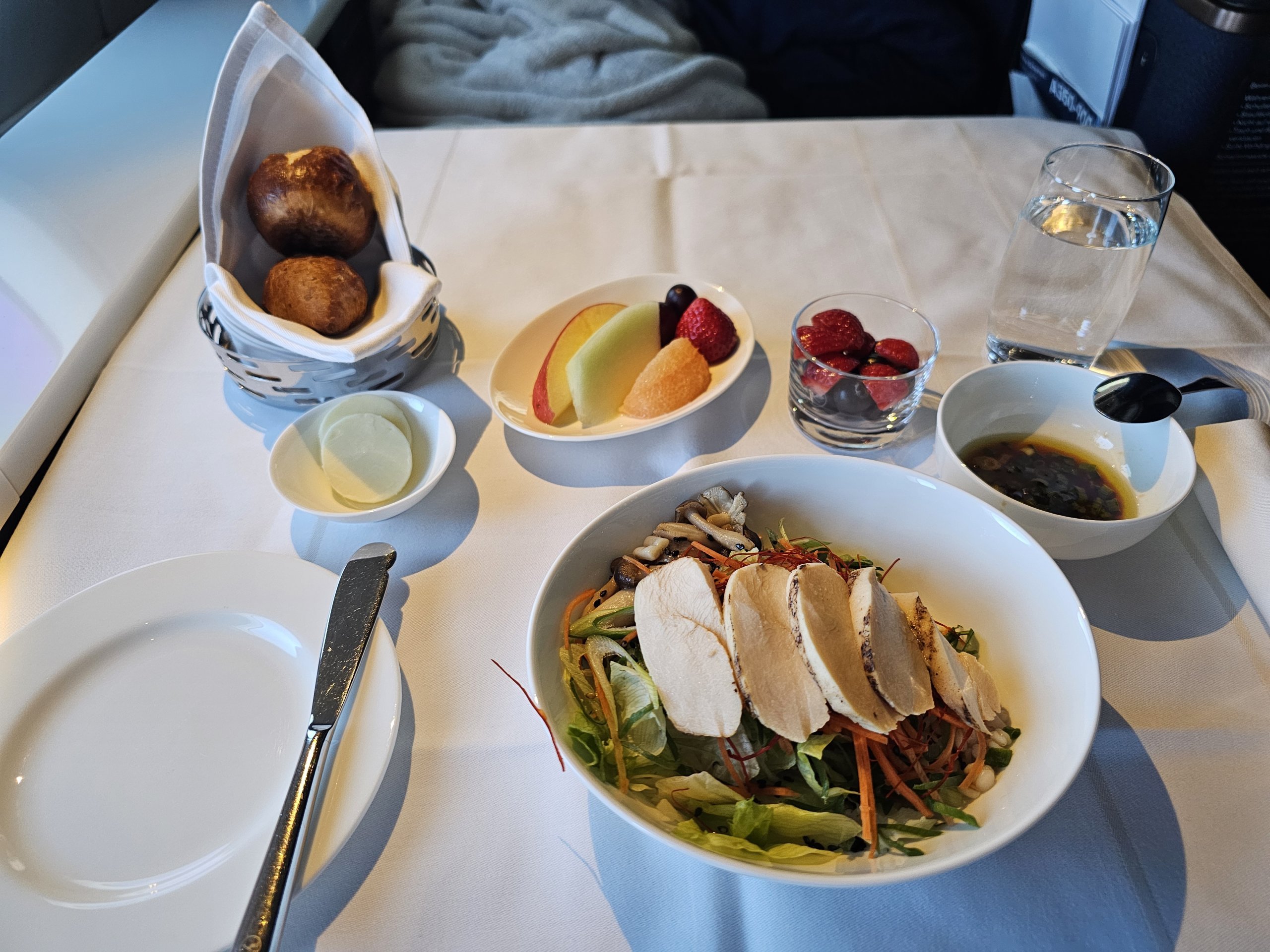 Die Vorspeise ist sehr frisch, bunt, leicht und großartig! Mir gefällt die Präsentation, und im Vergleich zum Service in der Business Class sind die Speisen reichhaltiger und viel abwechslungsreicher.