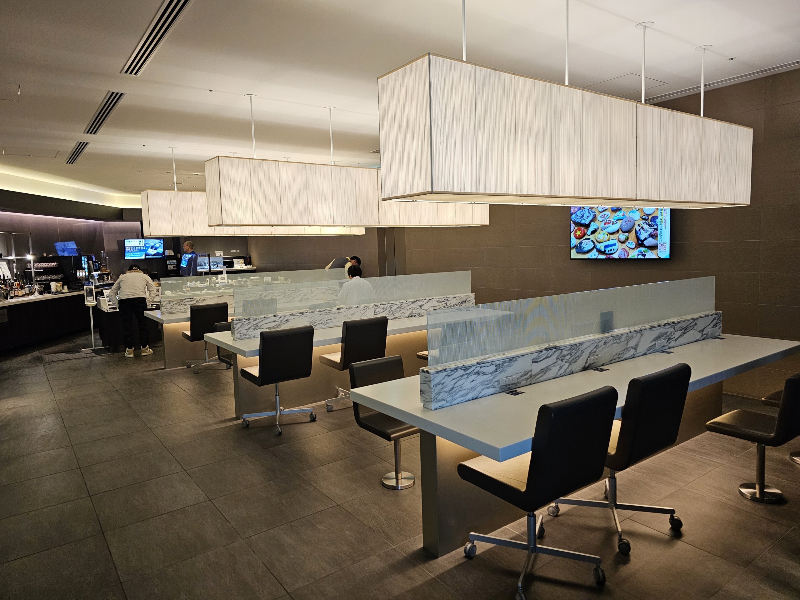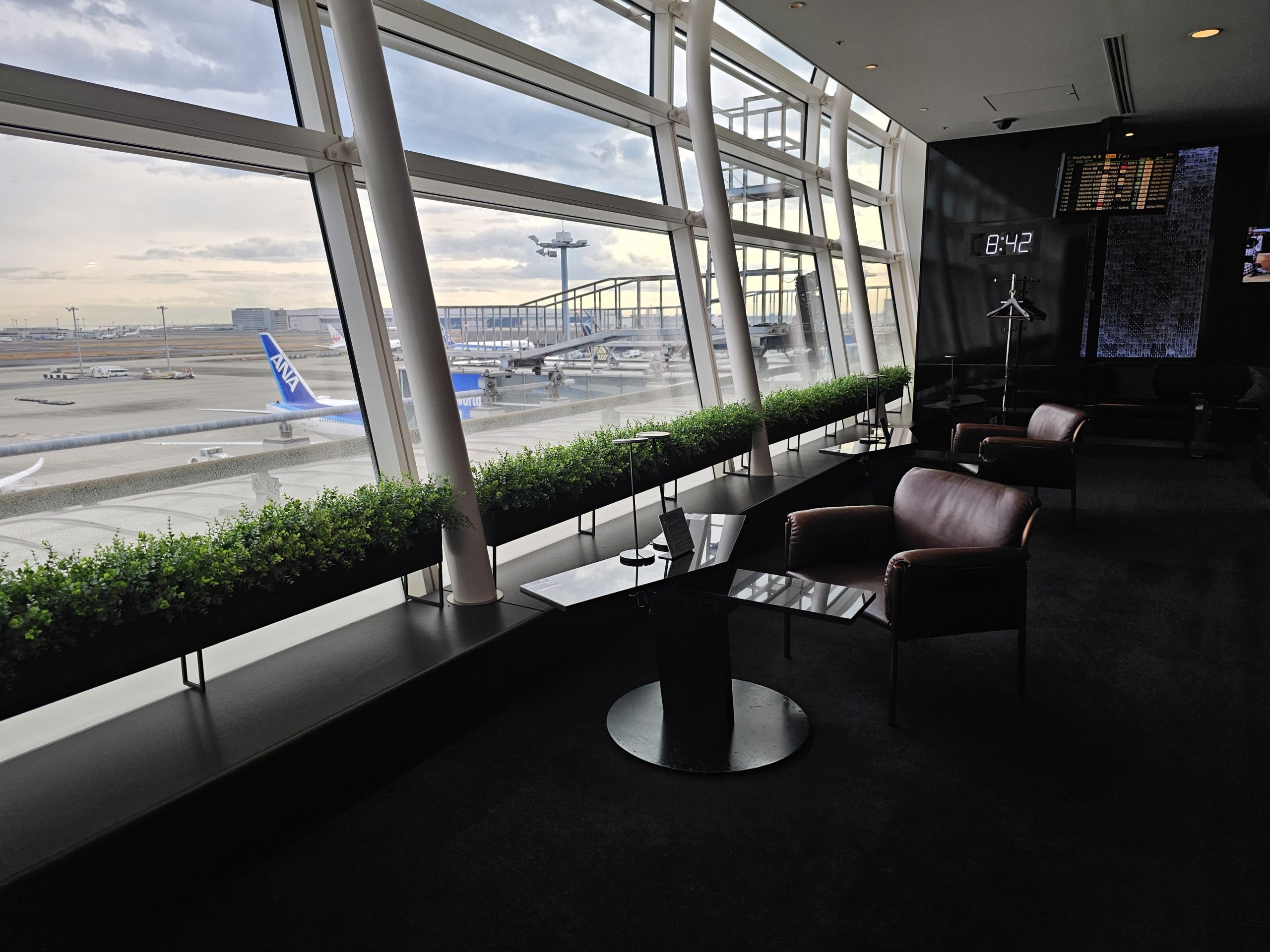 Die Lounge ist sehr geräumig und bietet einen tollen Blick auf das Rollfeld und viele Kabinen, die den First-Class-Sitzen von ANA Japan Airlines nachempfunden sind.