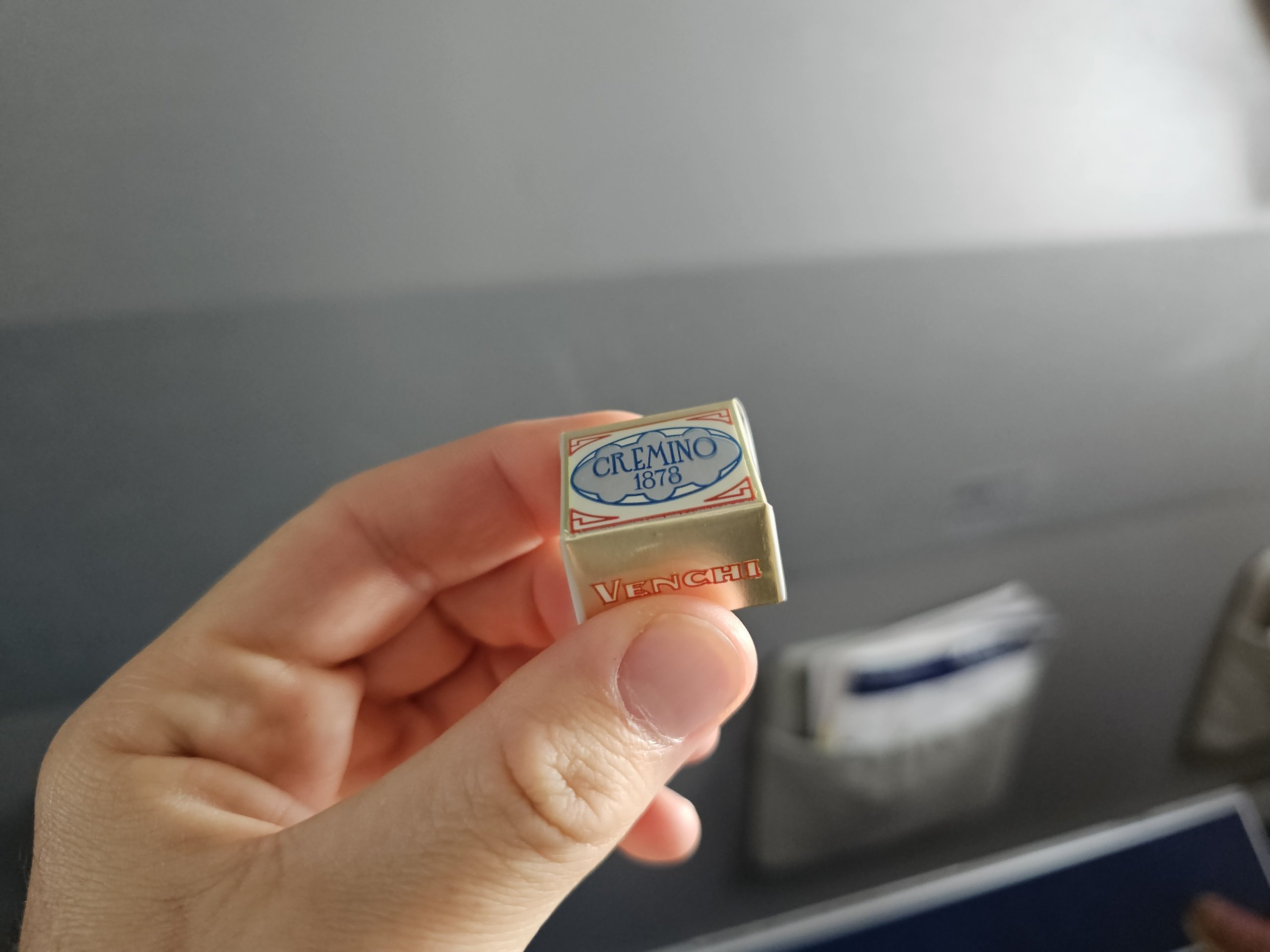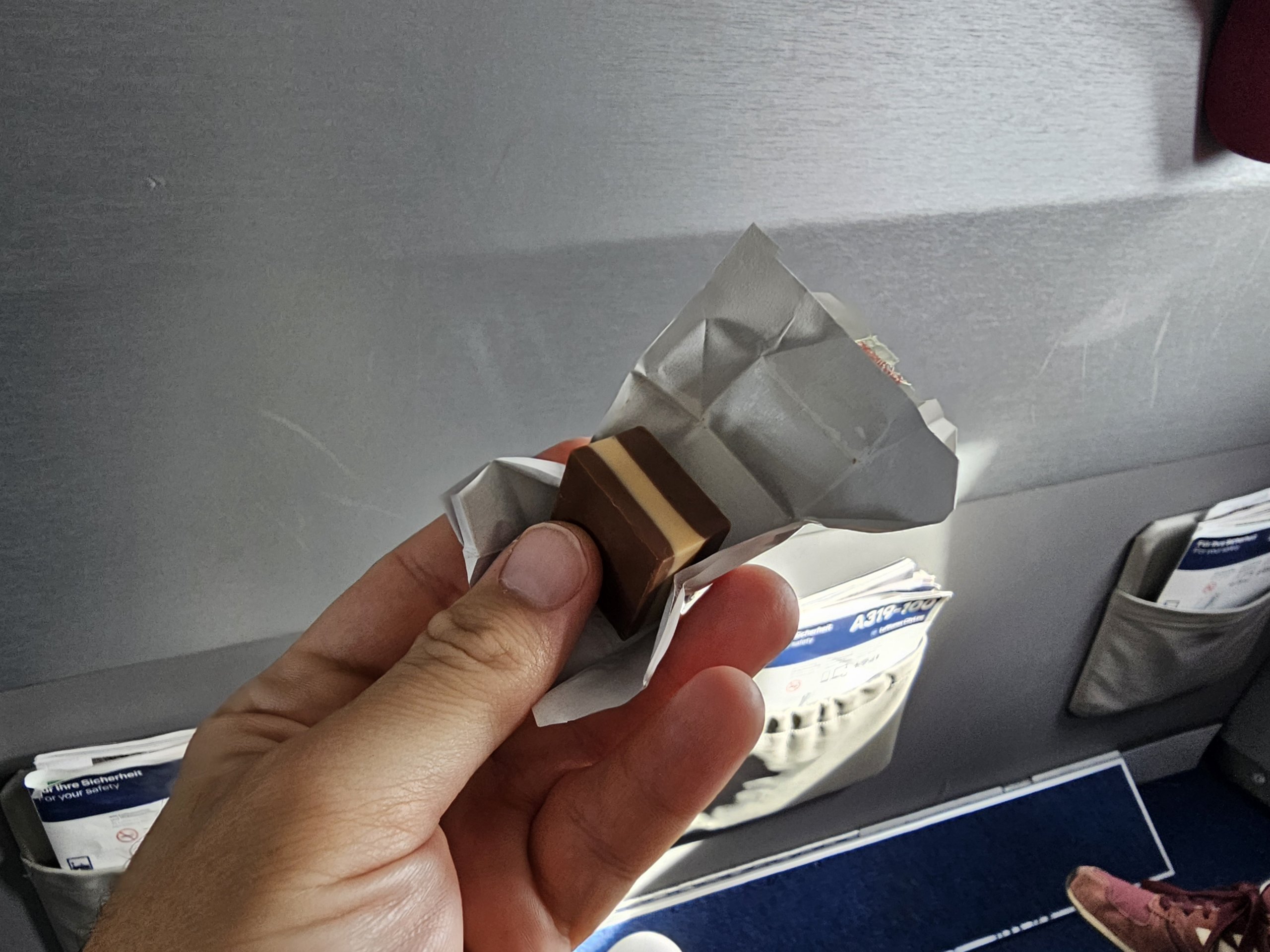 Kurz vor der Landung bekommen wir noch eine kleine stilvolle Schokolade.