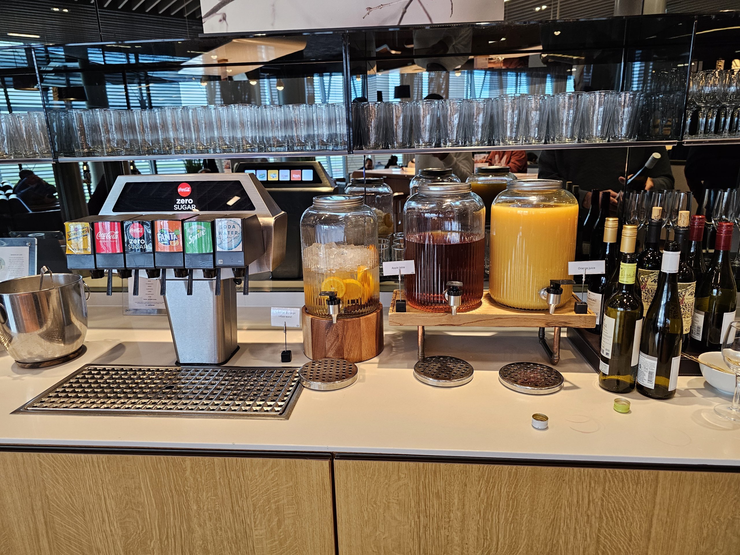 Die Erfrischungstheken befinden sich kompakt in einem Teil der Lounge rechts vom Eingang.