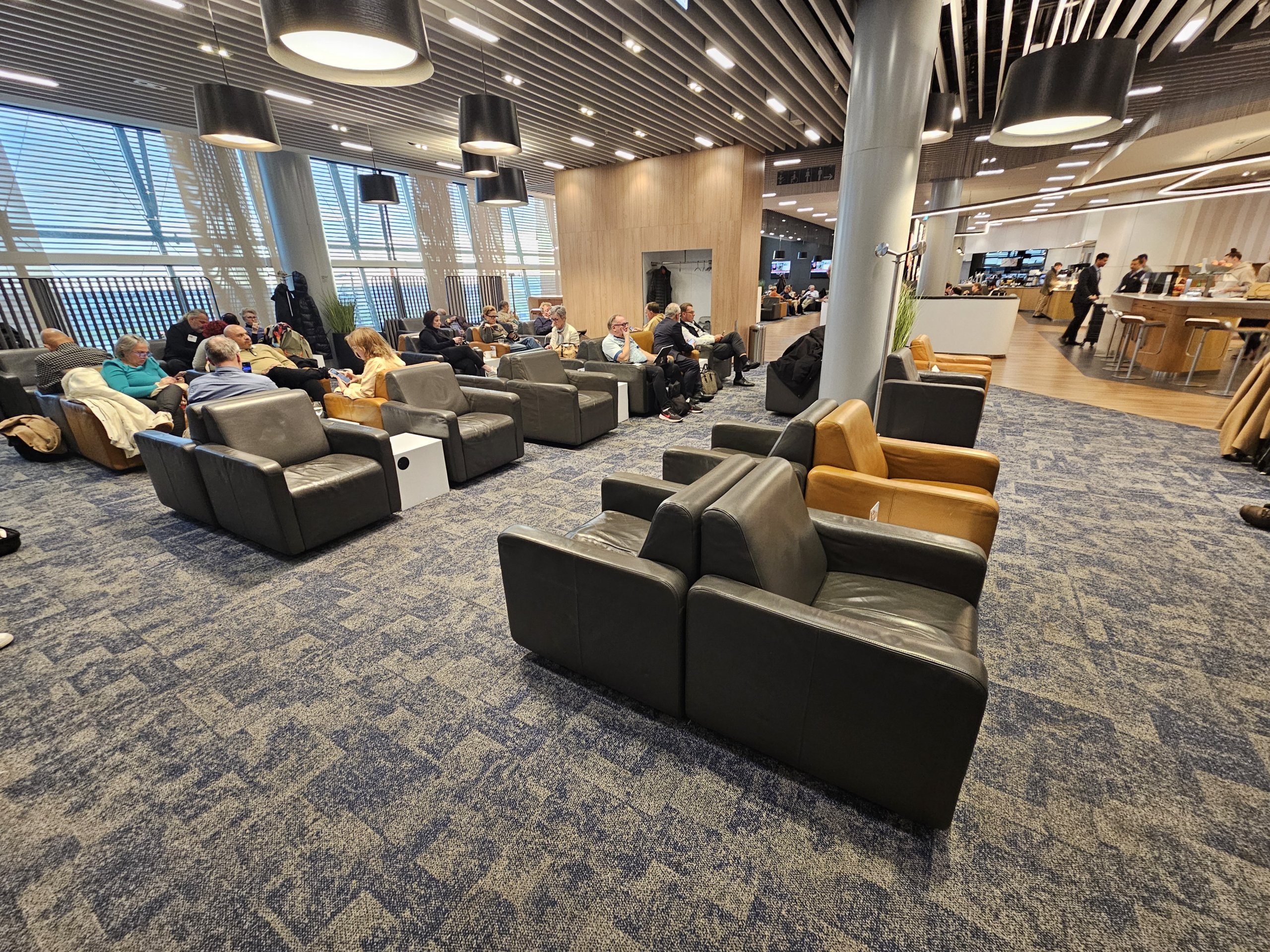 Der größte Teil der Lounge besteht aus bequemen Sesseln, die sich perfekt zum Entspannen eignen, aber nicht so sehr zum Essen oder Arbeiten am Laptop.