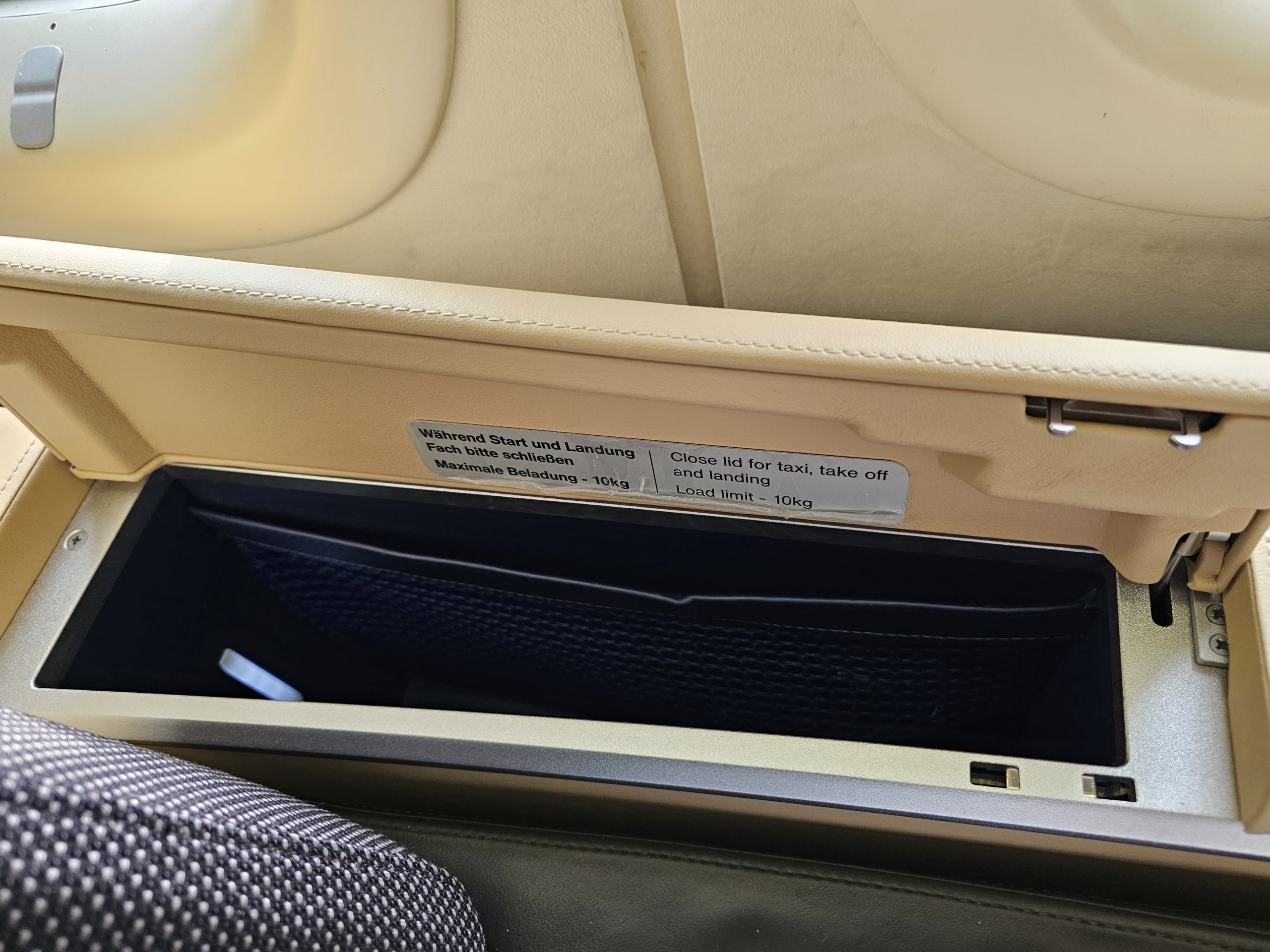 Ich habe zwei geräumige Fächer zwischen dem Sitz und den Fenstern, in die alle meine Dokumente wie Reisepass, Bordkarten, aber auch eine große gedruckte Speisekarte oder große Kopfhörer passen.