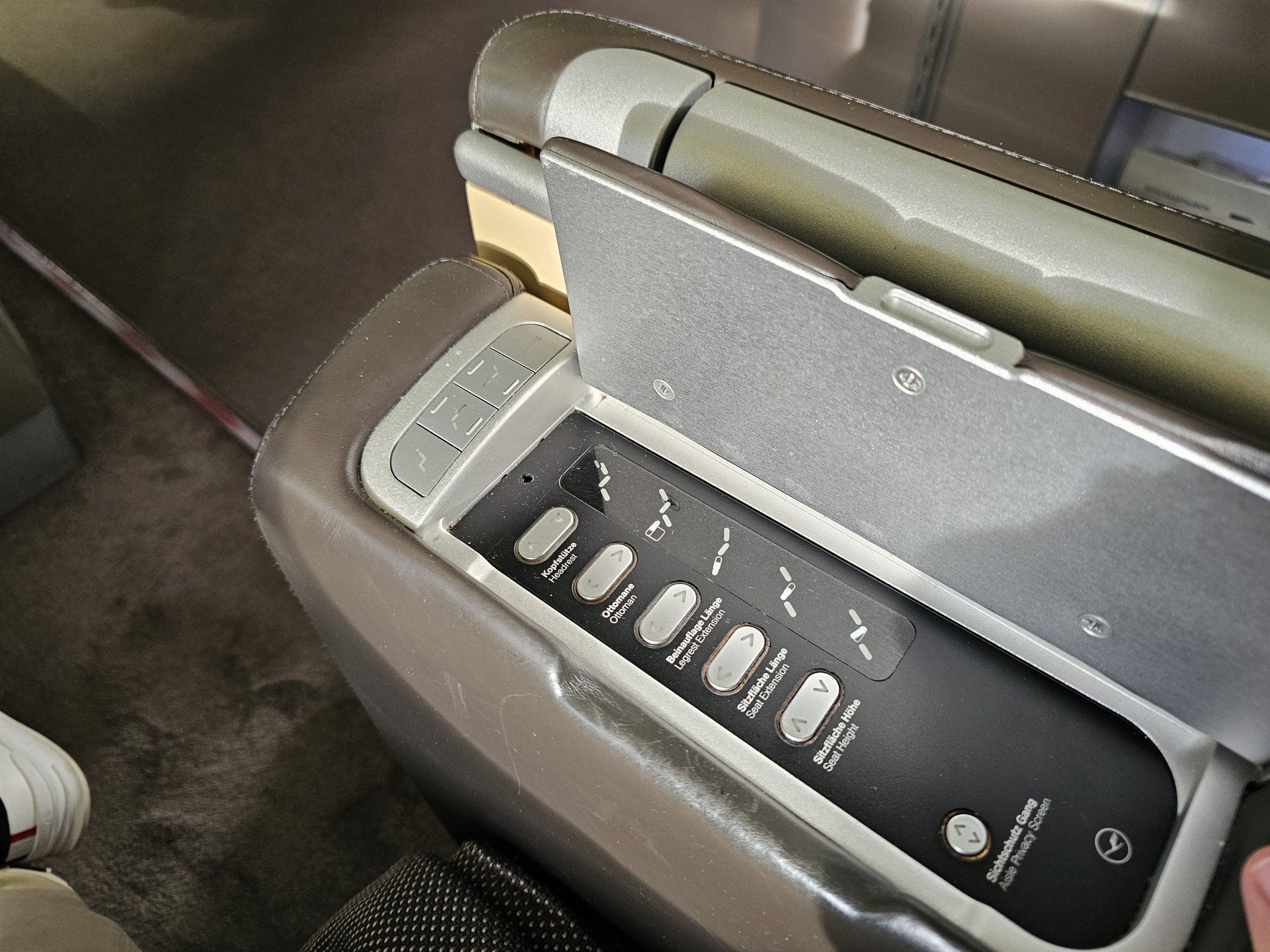 Der Sitz hat zwar einen ausziehbaren Bildschirm, aber es ist nicht ganz dasselbe. Die Privatsphäre ist auf dem Niveau besserer moderner Business-Klassen.