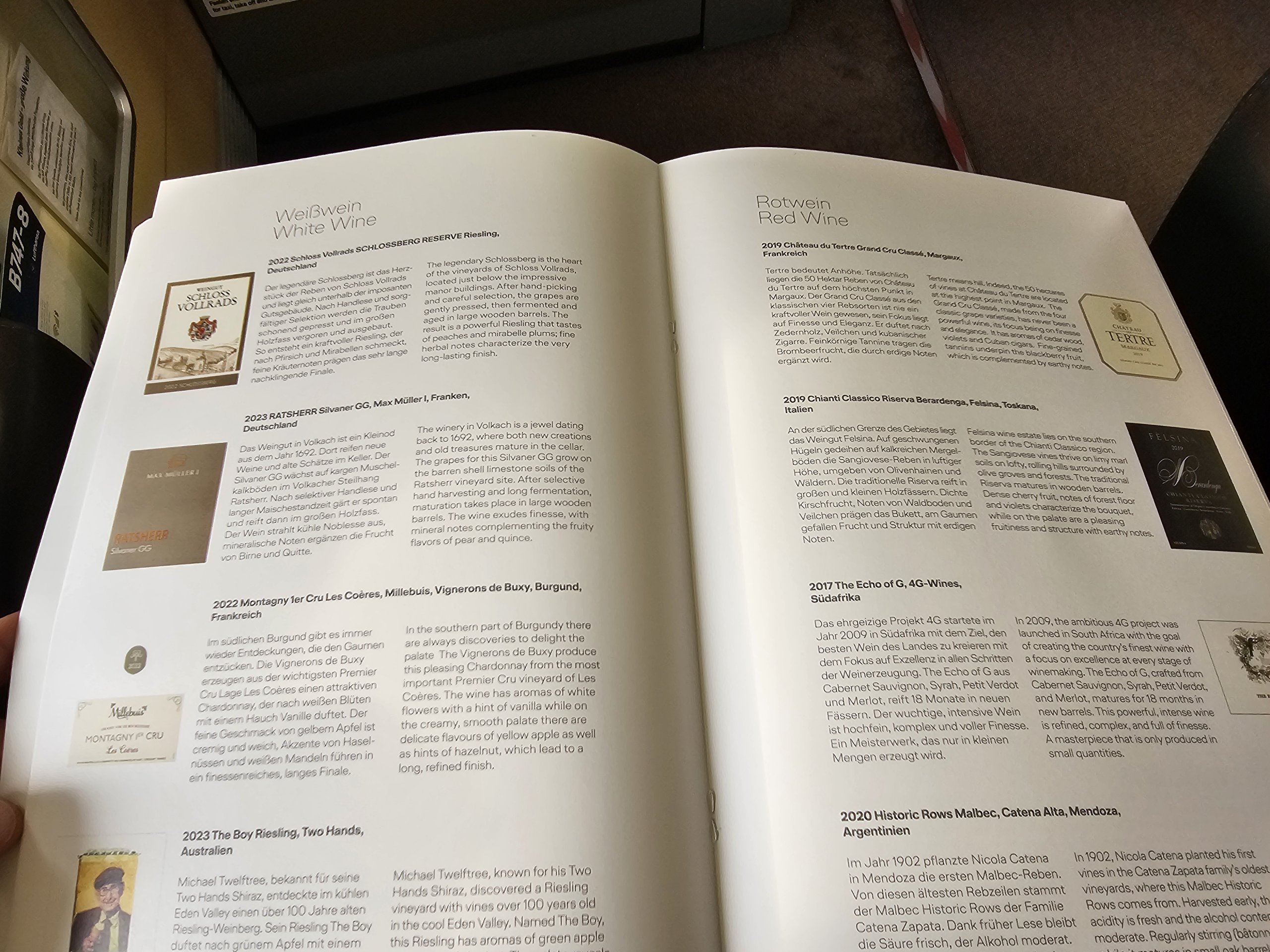 Vor der Abfahrt erhalten alle Passagiere eine gedruckte Speisekarte und eine sehr umfangreiche Weinkarte.