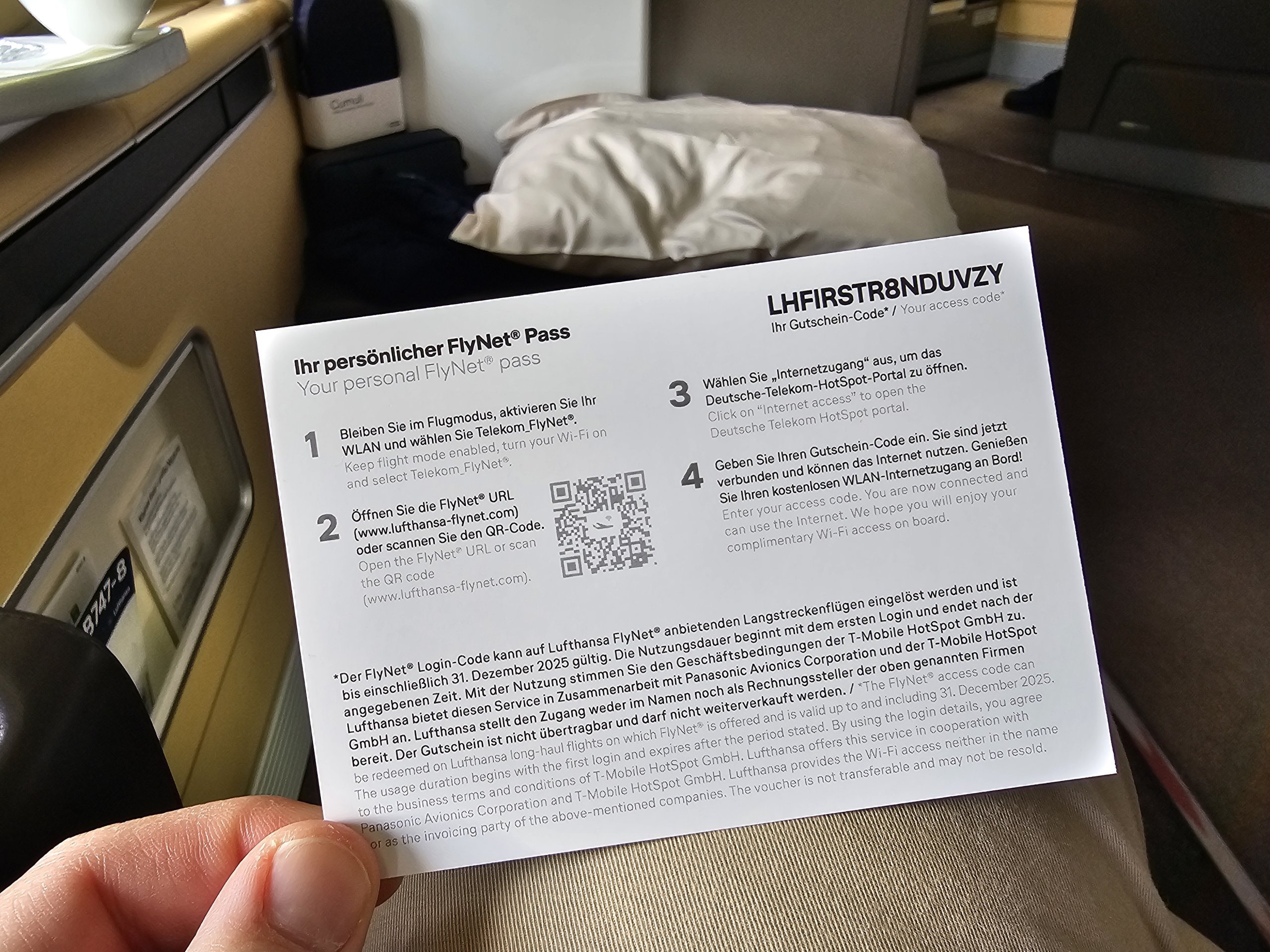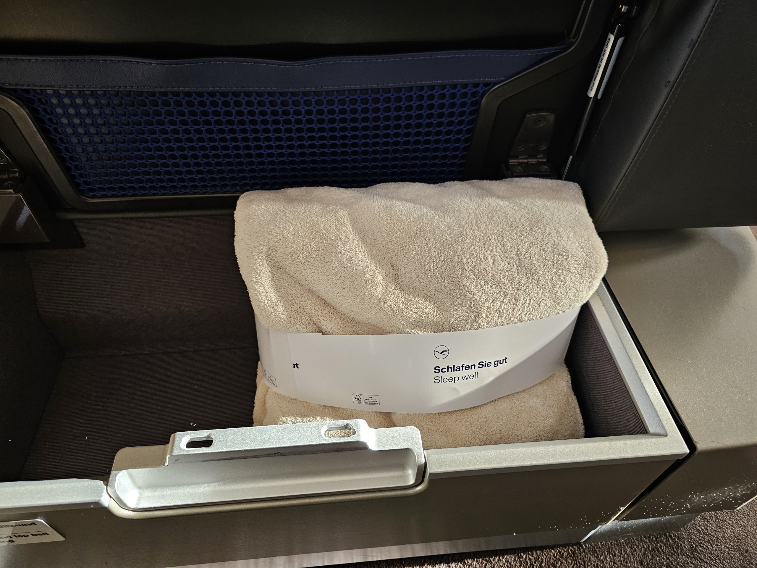 Der Sitz ist mit einem äußerst bequemen Kissen und einer Decke ausgestattet, die man während des Fluges jederzeit benutzen kann. Zum Schlafen erhalten Sie dann von der Crew eine weitere Decke und Bettzeug.