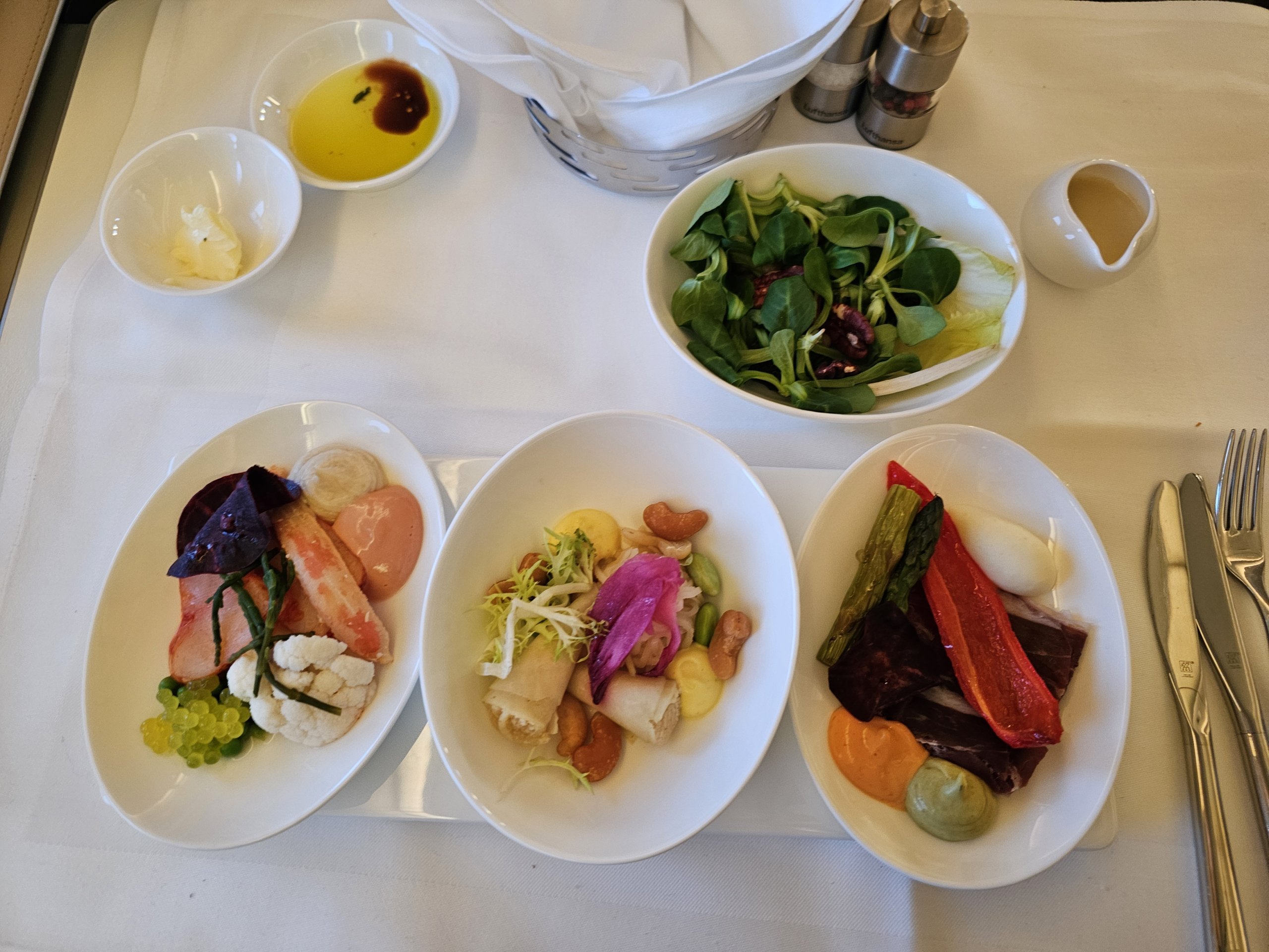 Die Vorspeise ist sehr frisch, bunt, leicht und lecker! Mir gefällt die Präsentation, und im Vergleich zum Business-Class-Service gibt es mehr Speisen und viel mehr Abwechslung.