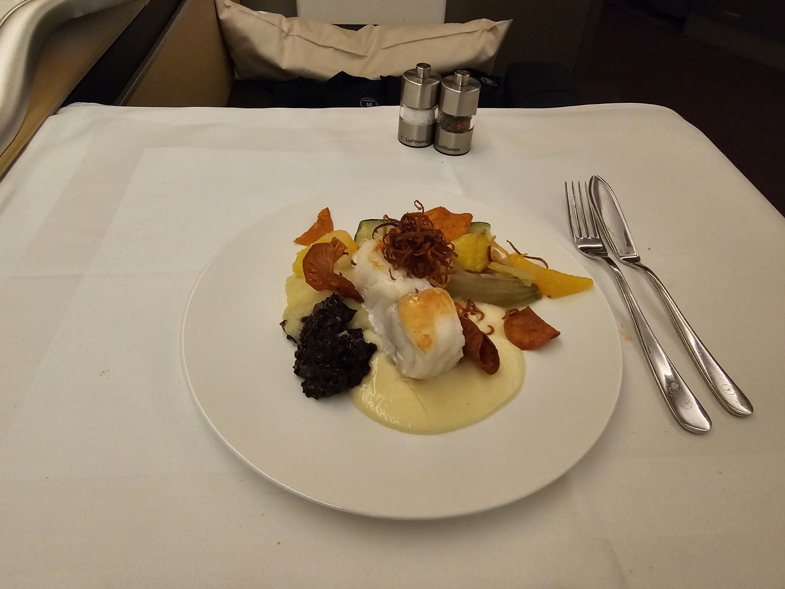 Als Hauptgang wähle ich den Fisch - Seeteufel - mit Beurre Blanc-Sauce. Diesmal ist die Präsentation für mich viel schlechter als bei den Vorspeisen, aber das Gericht ist lecker und vor allem leicht. Genau so stelle ich mir das bei einem Langstreckenflug vor.
