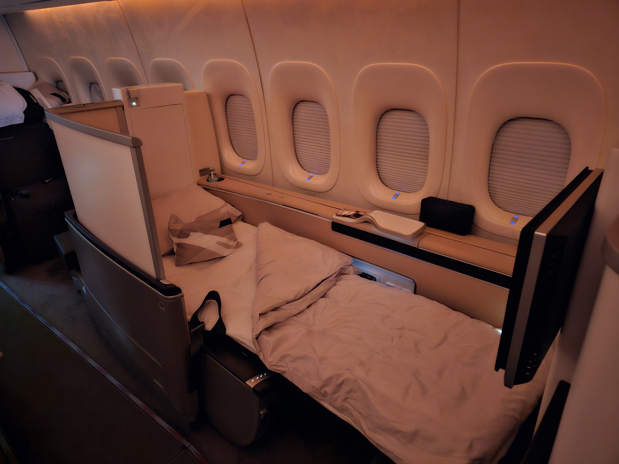 Etwa 2 Stunden vor der Landung habe ich mein Bett in den Sitz zurückgeklappt. Insgesamt habe ich weniger als 7 Stunden geschlafen.