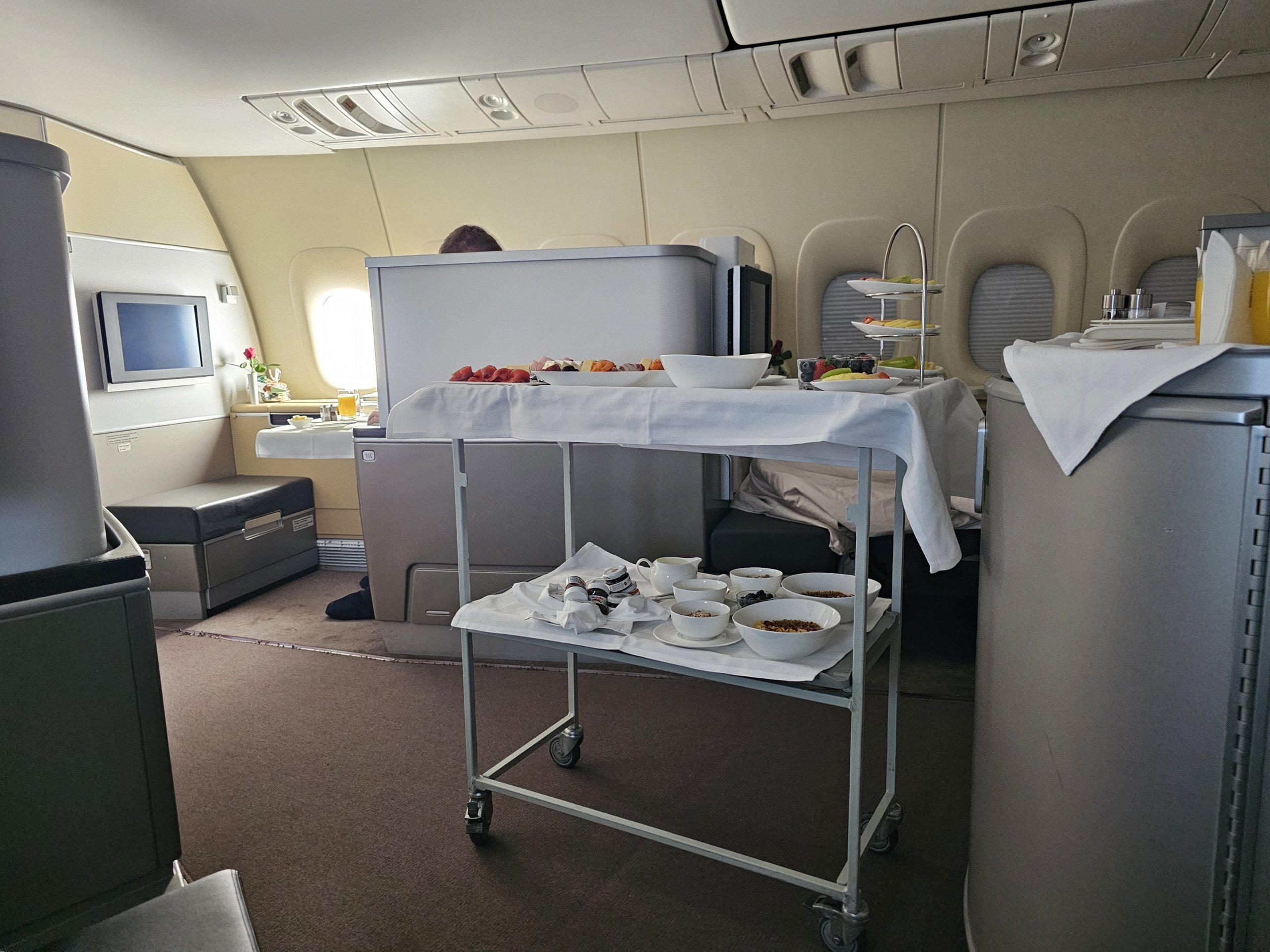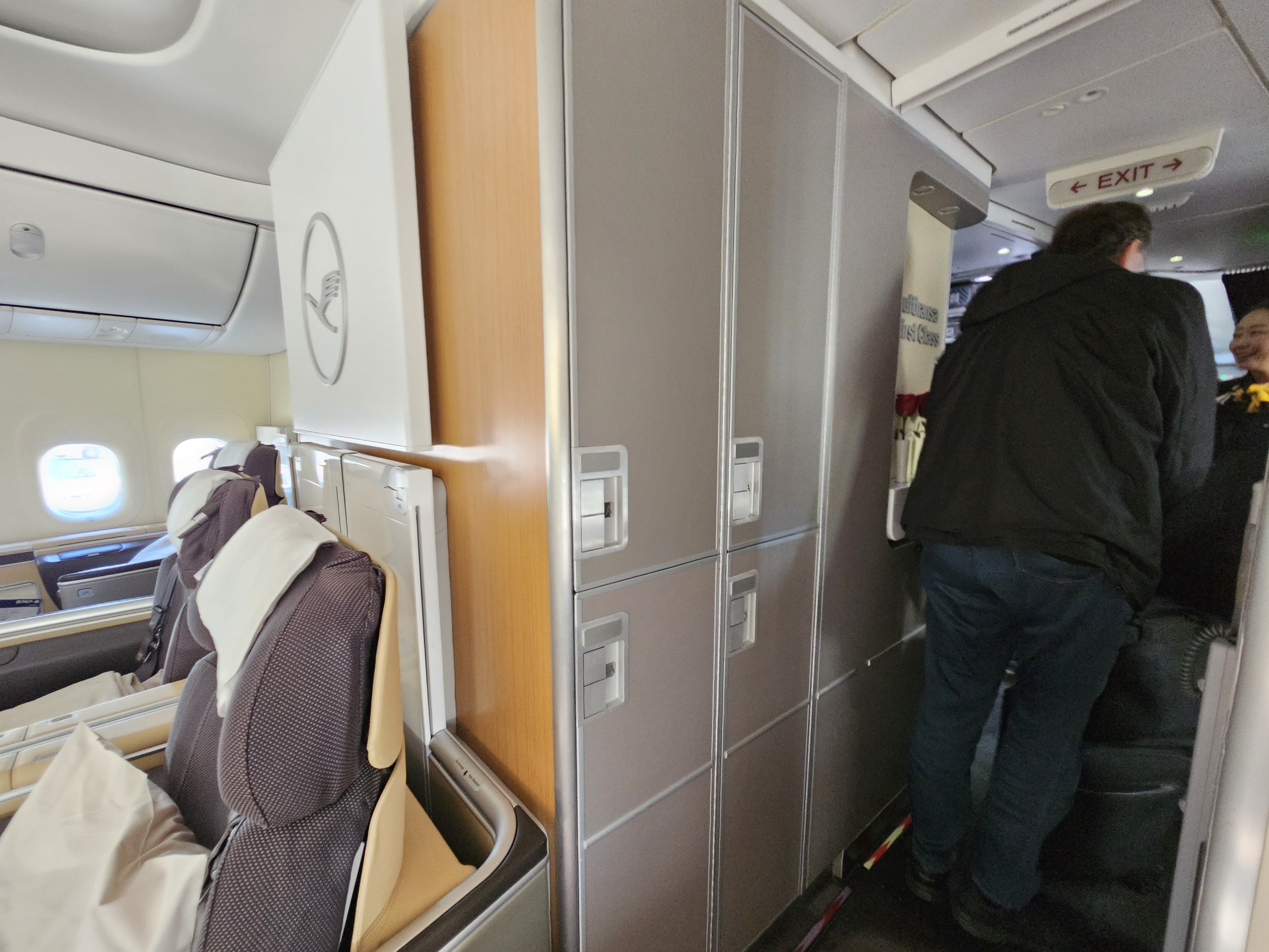 Die Sitze in der alten First Class der Lufthansa sind nicht durch eine Tür oder einen bodenhohen Vorhang vom Gang getrennt, sondern nur durch einen relativ niedrigen Bildschirm, der einfach nicht das Gefühl einer vollständigen Privatsphäre vermitteln kann.