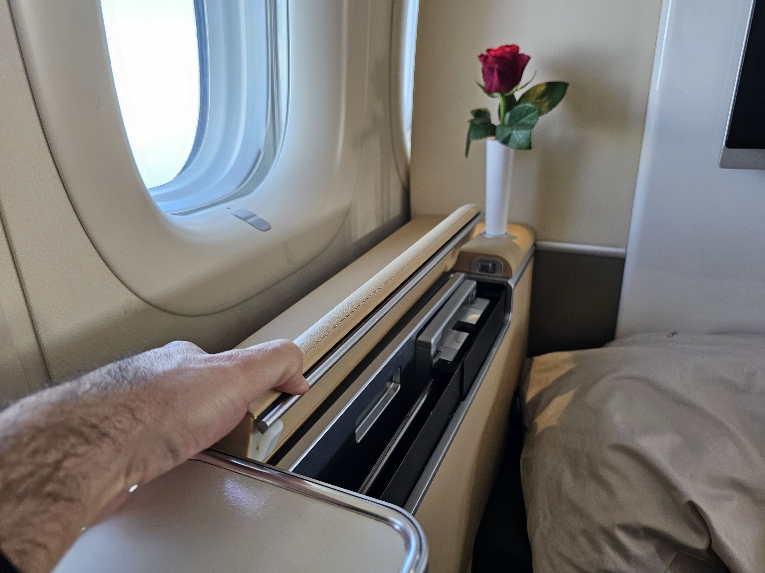 Das erwarte ich heutzutage einfach in einer modernen, hochwertigen First Class (und habe es zum Beispiel auf dem Rückflug in einer Allegris-Kabine bekommen).