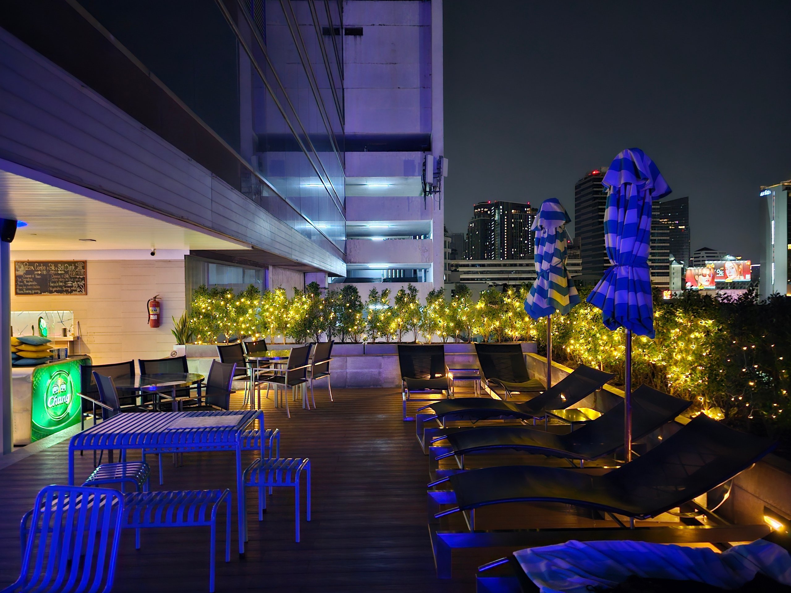 Der Pool ist nicht besonders groß, aber er hat einen großen Vorteil - einen Blick auf die Skyline von Bangkok, einschließlich des zweithöchsten Wolkenkratzers , King Power Mahanknhon.