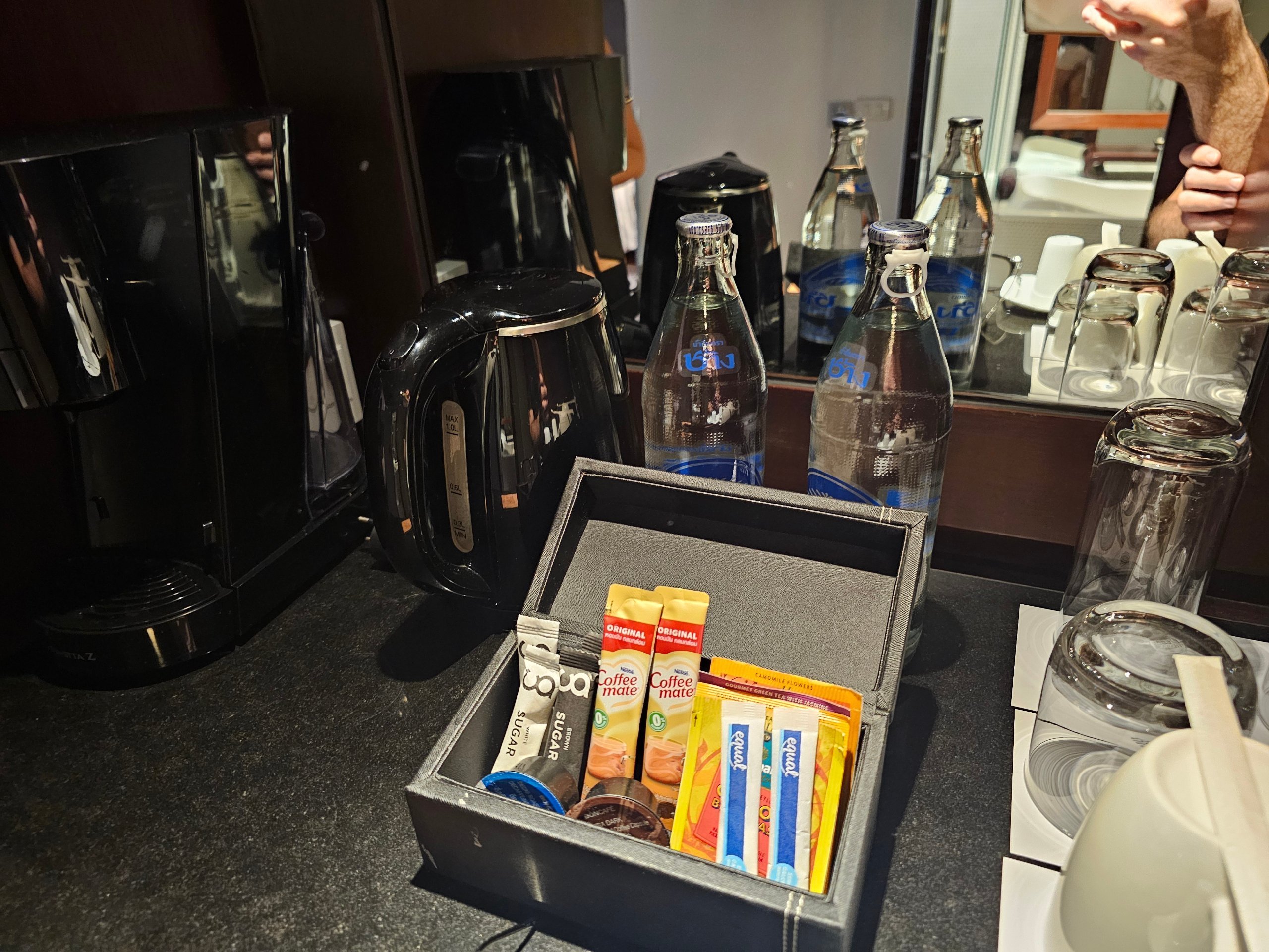 Das Bett ist ein klassisches Kingsize-Bett mit einer ziemlich festen Matratze, wie es in Hotels in Asien üblich ist. Für mich ist das Bett bequem und zusammen mit der Aussicht die beste Attraktion des Zimmers.