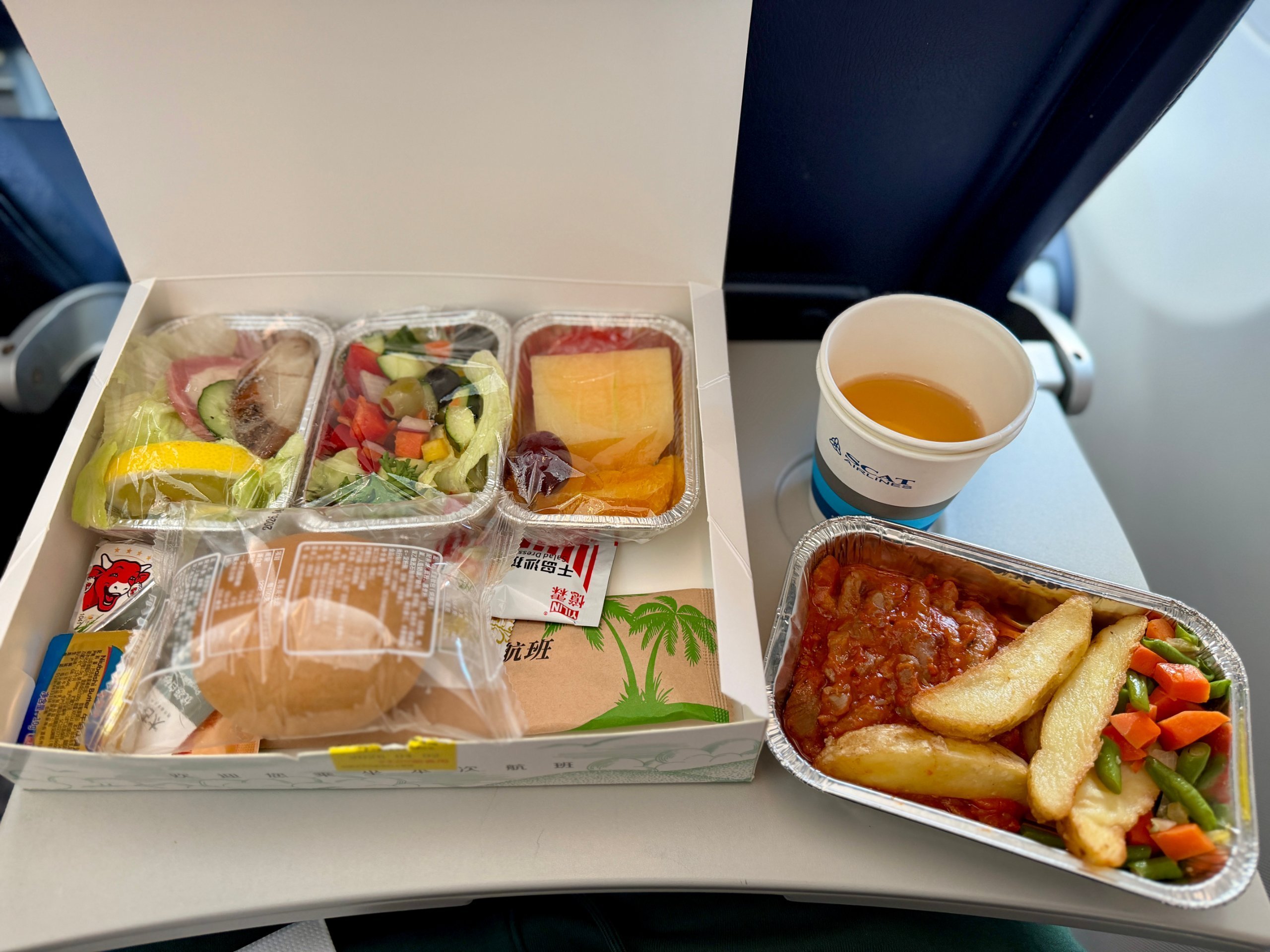 Der Abflug war am späten Nachmittag in Prag und die Landung kurz vor Mittag in China. Das Menü zum Abendessen war also zufriedenstellend, nur zum Frühstück hatte ich wieder etwas anderes als Huhn oder Rindfleisch erwartet.