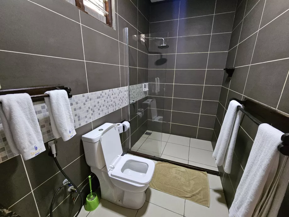 Das größte Problem, das ich habe, ist das Badezimmer. Die Toilette ist eindeutig die billigste, die es geben kann, und der Toilettensitz bleibt nicht richtig an seinem Platz.