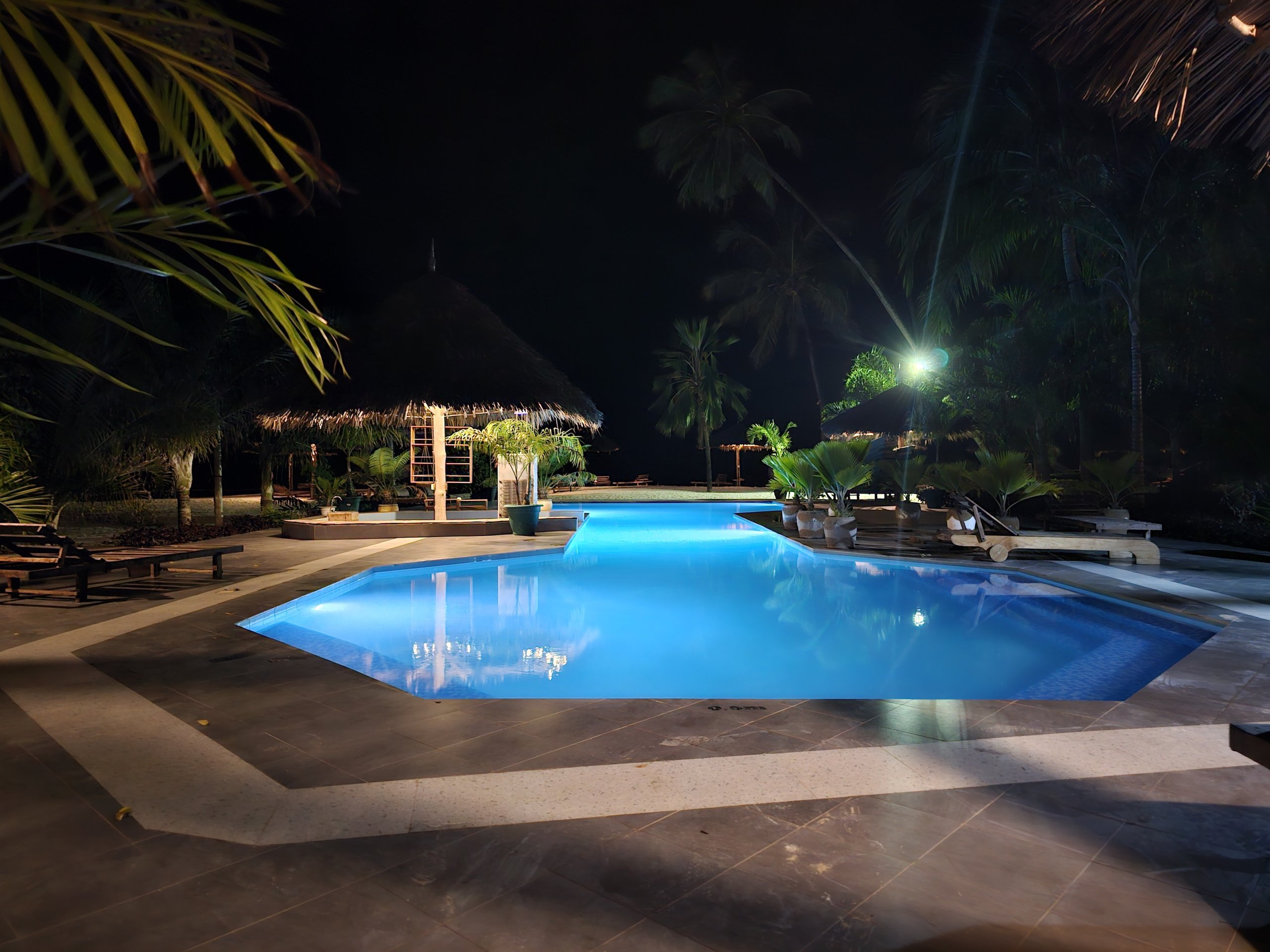 Der Pool ist rund um die Uhr zugänglich und wird nachts schön beleuchtet.