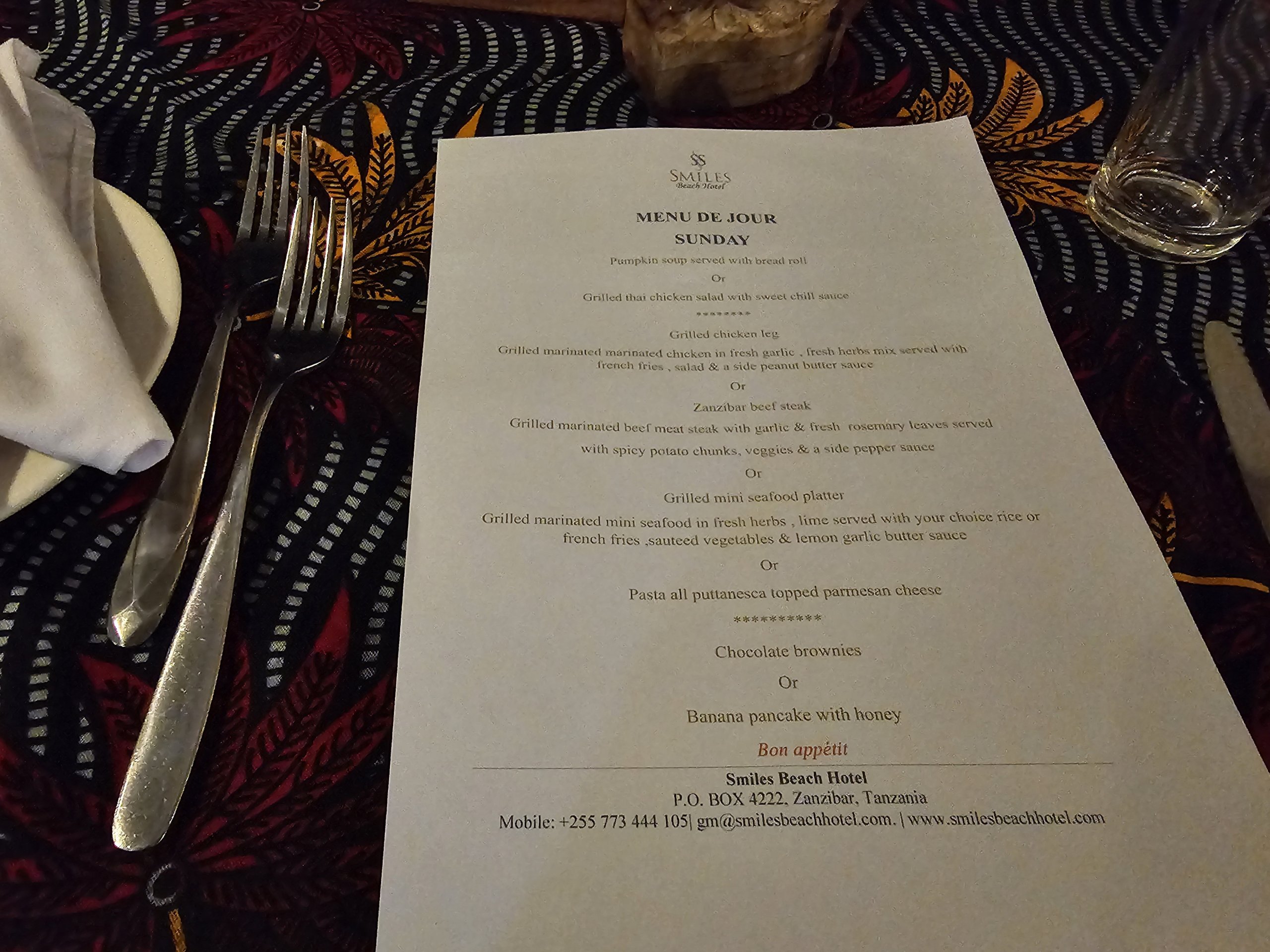 Auf den ersten Blick ist die Speisekarte sehr dürftig, aber im Vergleich zu anderen Hotels der gleichen Kategorie auf Sansibar, wie z.B. der Sea View Lodge in Jambiani, wohin ich von Nungwi gezogen bin, ist sie sogar überdurchschnittlich gut.