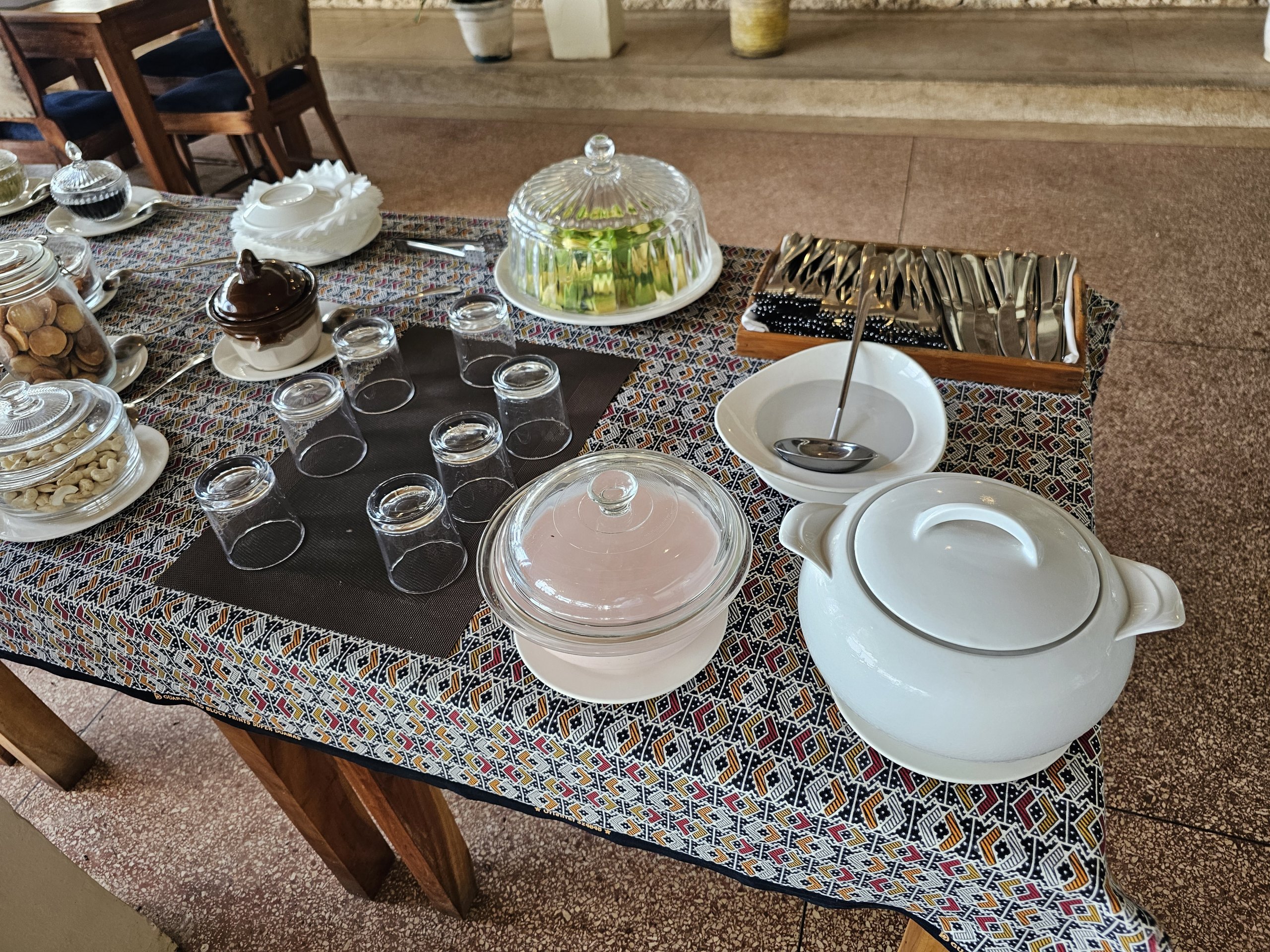 Außerdem gibt es Joghurt, zwei bis drei Obstsorten, süßes Gebäck, getoastetes Brot und immer zwei Sorten Saft + Wasser.