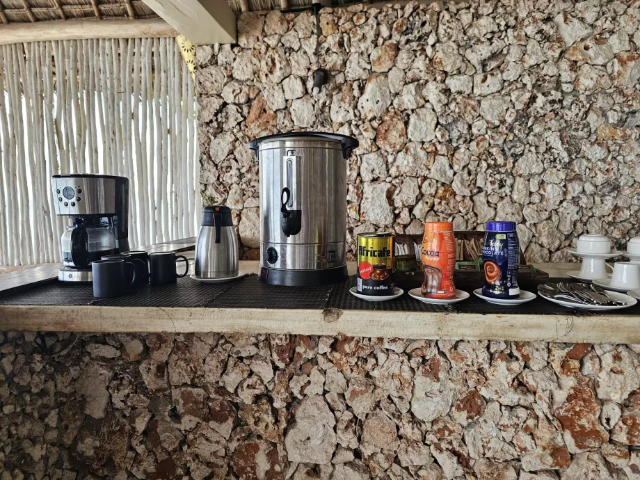 Es gibt ungefilterten Filterkaffee und abgepackte Tees.