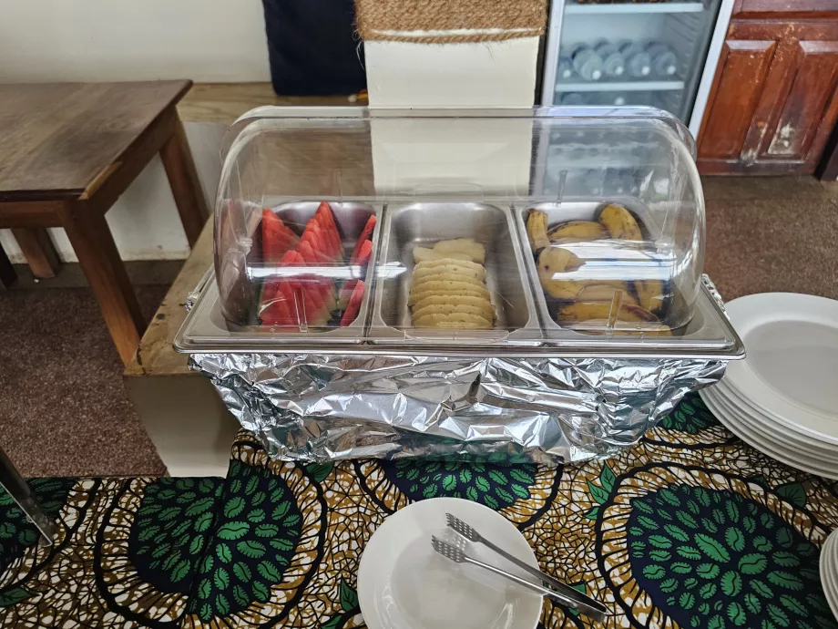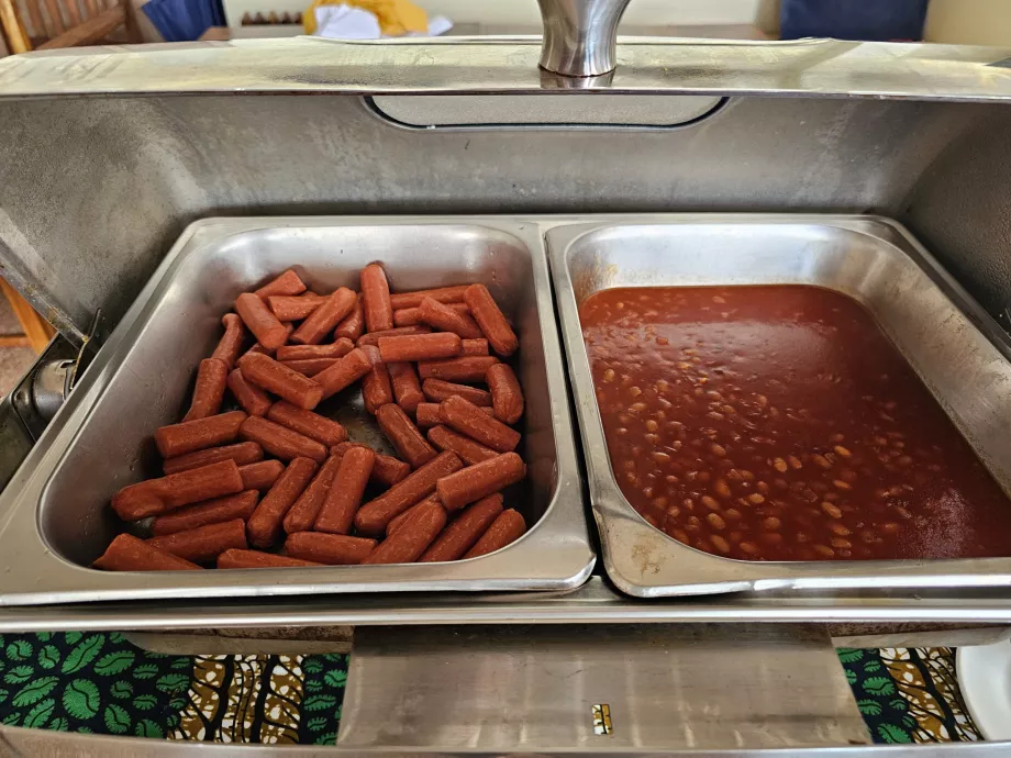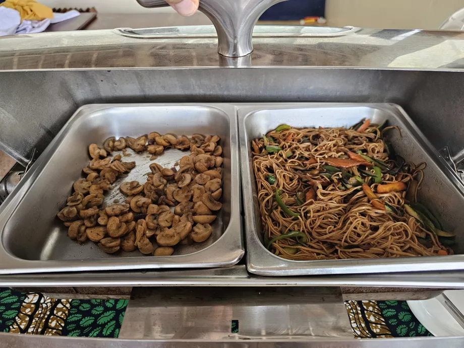 Es gibt drei Arten von warmen Speisen zur Auswahl - meist Nudeln oder Reis, Würstchen von sehr schlechter Qualität, Chapati-Pfannkuchen oder anderes lokales Gebäck, gekochtes Gemüse, Bohnen oder Pilze.