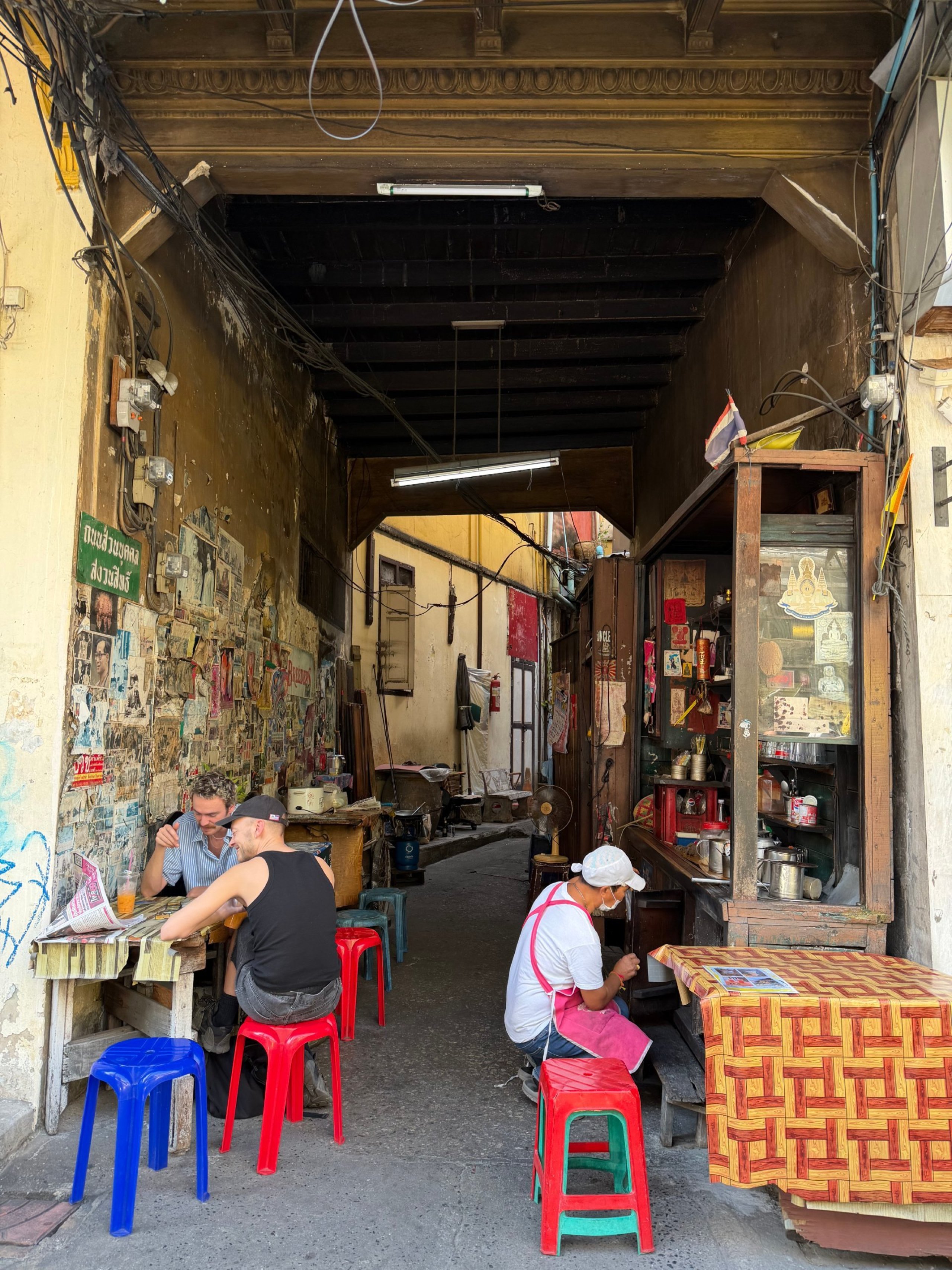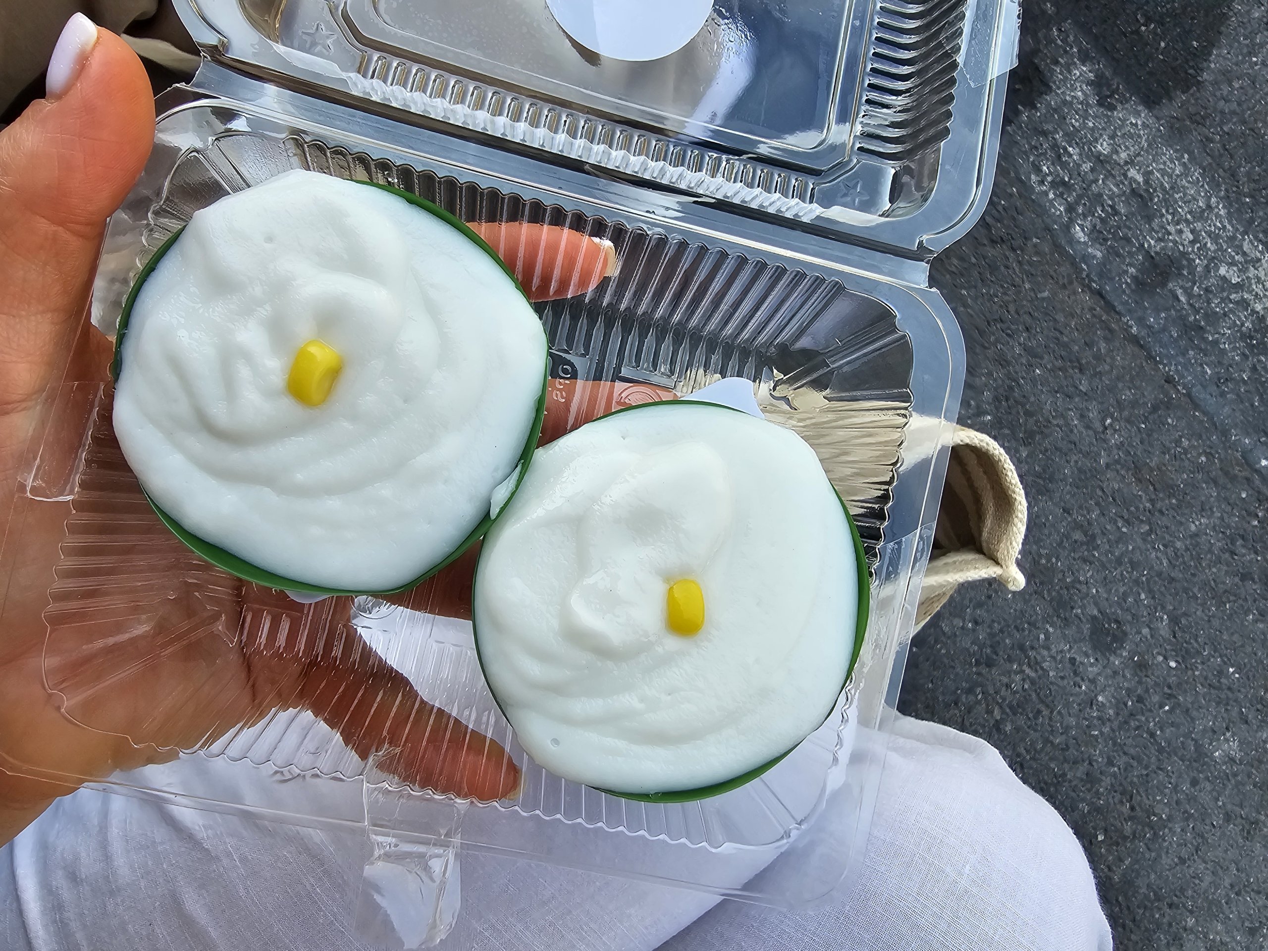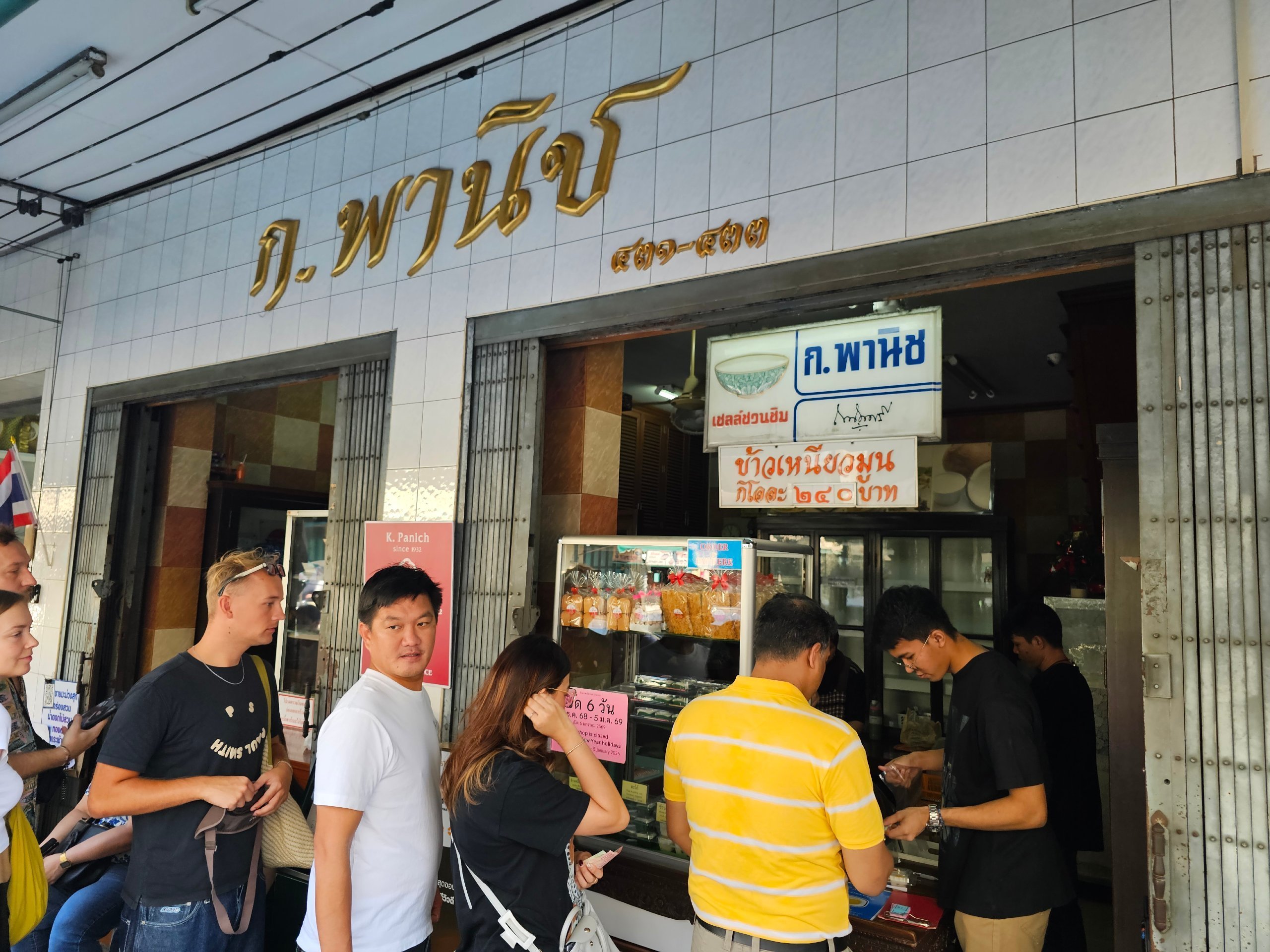 Das Bistro hat ein Fenster zur Straße hin und einen kleinen Raum zum Sitzen. Es war gerade viel los dort, also haben wir unseren Mango Sticky Rice und den traditionellen Thai-Pudding auf dem Bürgersteig nebenan gegessen.