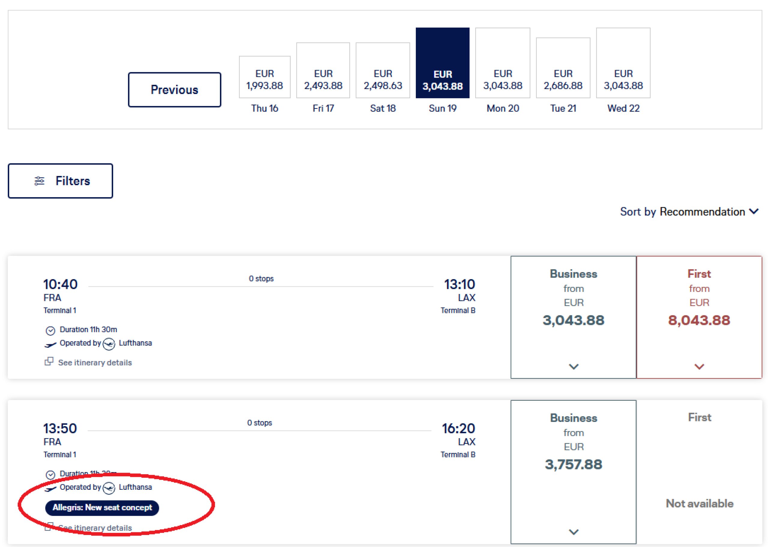 Es ist immer wichtig, eine bestimmte Flugnummer zu wählen. Auf manchen Strecken (z.B. Frankfurt - Los Angeles) gibt es mehrere Flüge pro Tag, aber nur einer davon ist mit Allegris-Sitzen ausgestattet.